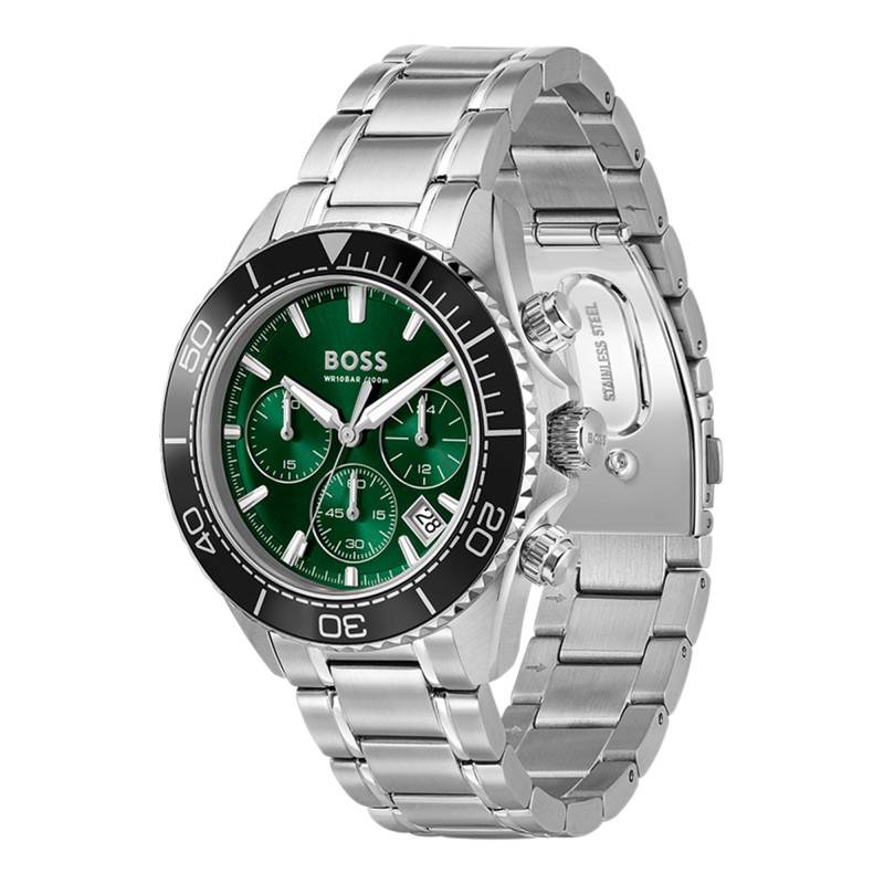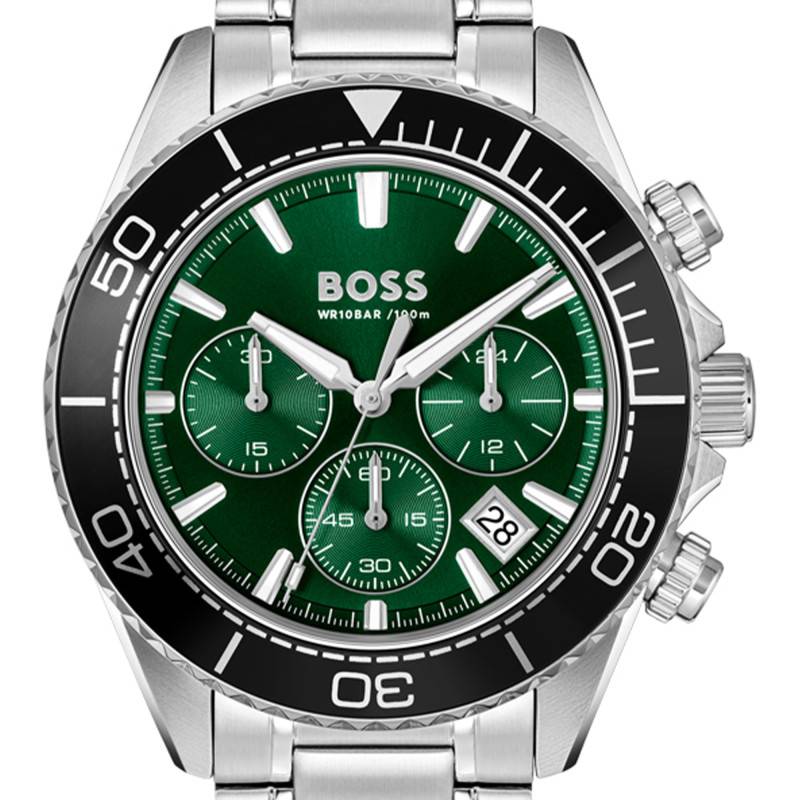D'une beauté éclatante, le cadran de la Boss Sealiner est remarquable par sa teinte verte et sa finition soleillée qui capte et diffuse la lumière de manière majestueuse, créant un effet visuel des plus raffinés. Les aiguilles et les index luminescents assurent une lisibilité accrue, même dans des conditions de faible luminosité. Ces éléments sont minutieusement alignés pour offrir un contraste parfait contre le fond du cadran, relevé par des chiffres arabes distinctifs et un chemin de fer des minutes. Les fonctionnalités du cadran sont enrichies par la présence de plusieurs compteurs additionnels - 24 heures, 60 minutes, et une petite seconde - facilitant l'utilisation des fonctions chronométriques, essentielles pour les amateurs de précision. Un guichet date discret situé à quatre heures permet un affichage rapide et efficace de la date du jour, une fonctionnalité pratique dans le quotidien de son utilisateur.