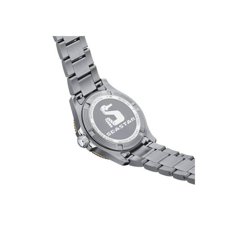 L'entrepreneur Charles-Emile Tissot fonde la maison horlogère suisse éponyme en 1853. Après avoir collaboré avec différents événements sportifs, la maison s'intéresse au développement de montres de plongée nécessitant de véritables prouesses techniques. La collection emblématique Seastar 1000 vous propose des montres dont l'étanchéité peut dépasser les 300 mètres de profondeur. Le modèle T120.210.11.041.00, étanche à 30 bar, comporte un boîtier en acier inoxydable 316L d'un diamètre de 36mm. C'est au-dessus d'un verre saphir avec double traitement anti-reflets que vous verrez très nettement le cadran. Cette glace est entourée par une jolie lunette bleue. A droite, une couronne vissée très protégée prend place. Le fond orné d'un hippocampe est vissé pour éviter toute humidité.