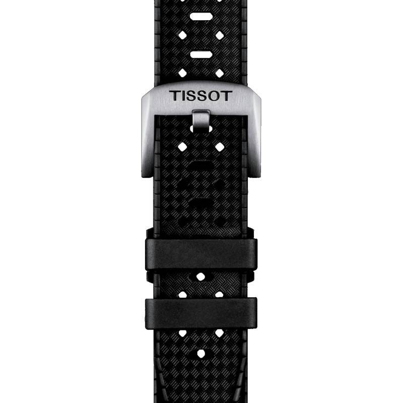 Tissot a choisi d'équiper ce garde-temps d'un bracelet entièrement fait en caoutchouc perforé. Il présente une couleur noire et un dessous conçu en synthétique pour un confort optimal. Ce dernier restera en toute sécurité au poignet des hommes grâce à sa boucle ardillon de teinte argentée. Notez que la largeur d'entrecorne de ce bracelet est de 20 mm.