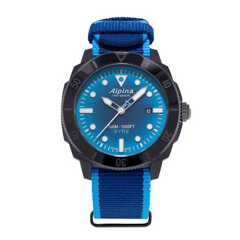 Plongez au coeur des profondeurs maritimes grâce aux divers indicateurs temporels présents sur ce cadran. Ce solide cadran de forme ronde arbore un fond d'une envoûtante couleur bleue. Sa finition fumée lui confère un avant goût des activités sportives aquatiques possibles au fond des océans. Vous retrouverez deux aiguilles et une trotteuse qui parcourent avec finesse le cadran pour vous délivrer en continu les heures, les minutes et les secondes. Alpina joue sur les formes géométriques au niveau de ses index en complétant cette lecture analogique du temps par des marqueurs revêtus d'un traitement luminescent. Les aiguilles sont également revêtues de ce traitement de surface et vous permettra ainsi de lire l'heure en milieu obscur. Un chemin de fer situé sur le pourtour du cadran viendra vous aider dans la lecture des minutes. Enfin, la maison n'oublie pas de signer son garde-temps sous l'index de midi et de rappeler son origine au niveau de l'index des 6 heures par la mention "Swiss Made". Fière de sa collaboration, elle appose le nom de Gyre et rappelle sa haute étanchéité au-dessus de ce dernier index.