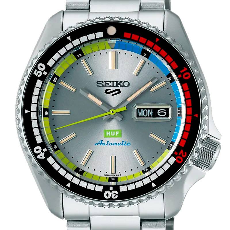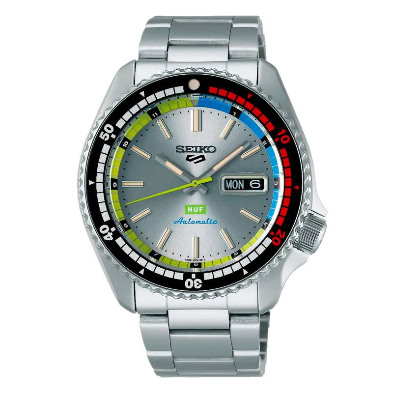 Ce cadran au design soigné apporte une belle allure à ce garde-temps. Il révèle un fond argenté sublimé par une finition soleillée, apportant cette touche éclatante. En bordure, il se pare d'un arc bleu et d'un arc vert. En son centre, il révèle trois aiguilles assurant une lecture temporelle fiable au quotidien. La fine trotteuse verte compte les secondes écoulées pendant que la grande et la courte aiguilles indiquent les minutes et les heures. Ces deux dernières sont argentées et revêtues d'un traitement lumibrite se trouvant également sur les index des heures en forme de bâton qui sont disposés sur le cadran. Ce revêtement luminescent garantit une lisibilité optimale en cas de faible luminosité. Les marqueurs sont complétés par un chemin de fer des minutes ainsi que par un guichet situé à 3 heures. Celui-ci est doté d'une double ouverture de fond noir et il affiche les jours de la semaine en anglais avec la date en cours. Ce cadran dévoile quelques mentions vers 6 heures avec la marque de skate 'HUF" et le type de mouvements. Sous 12 heures, le nom de la marque et le logo "5" sont apposés en guise de signature.