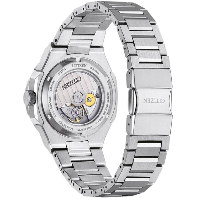 Citizen est motivée par sa passion pour les défis. À travers ses collections, elle offre des expériences absolument uniques et un style indéniable en vous proposant des garde-temps hautement sophistiqués dans le but de vous sublimer au quotidien. Alliant technicité et robustesse, la marque italienne vise des modèles parfaitement aboutis qui vous accompagneront dans vos plus grandes aventures. Découvrez la nouvelle montre Série 8 NB6031-56E qui ornera les poignets masculins. Elle arbore un boîtier tonneau de 41 mm de diamètre et d'une épaisseur de 13,40 mm. Conçu en acier inoxydable, ce dernier est parfaitement résistant et arbore une charmante finition brossée accentuant son charme. Sur la droite, il dévoile une couronne grise d'aspect cranté mesurant 7 mm qui permet la manipulation des éléments centraux avec la plus grande facilité. Ces derniers se situent sous un verre saphir qui les protège des chocs et qui est entouré par une lunette bicolore arborant des encoches pour plus de distinction. Celle-ci est bidirectionnelle et comporte une échelle 24h représenté par des index bâtons s'alternant avec des chiffres arabes. Pour finir, ce boîtier est muni d'un fond vissé et transparent qui permet d'apprécier les rouages du mouvement et assure une étanchéité de 10 ATM.