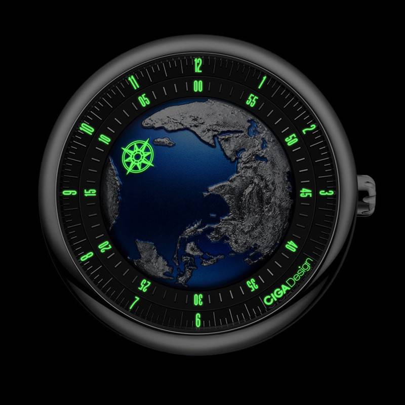 Le cadran de la montre est une œuvre d'art en soi, avec sa carte du monde finement sculptée, inspirée des routes anciennes et des joyaux culturels de la Route de la Soie. Méticuleusement réalisé grâce à la technologie CNC, il capture l'essence de la Terre avec une précision sans pareille. Le fond bleu profond symbolise l'immensité des océans, tandis que les nuances de gris évoquent les continents. Ce contraste de couleurs est rehaussé par le verre saphir bombé, exaltant les détails du cadran tout en assurant une protection optimale contre les chocs et rayures. Les index luminescents se démarquent distinctement sur ce fond, offrant une lisibilité accrue quelles que soient les conditions de lumière. De plus, grâce à sa rose des vents, le cadran propose une lecture innovante des heures et minutes, incarnant une vision originale et sophistiquée du temps.