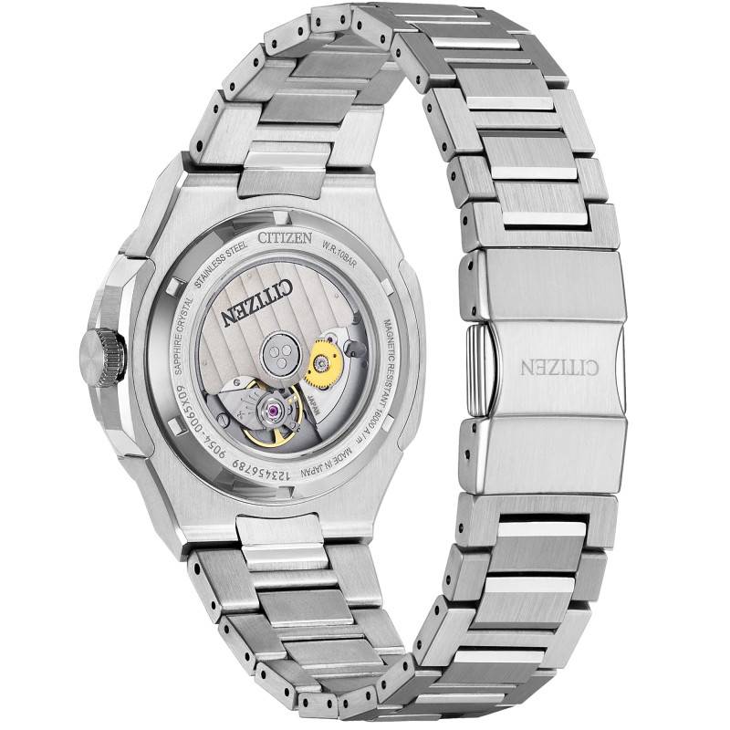 Sous cette silhouette élégante se trouve un véritable concentré de technologie, le mouvement automatique Citizen calibre 9054, représentant le summum de la précision japonaise. Ce mouvement offre une réserve de marche de 50 heures, assurant que votre garde-temps reste en fonction même après deux jours sans être porté. Le mouvement bat à une fréquence de 28,800 A/h (4 Hz), garantissant un affichage du temps extrêmement précis et régulier. Une caractéristique notoire de ce calibre est sa résistance magnétique, qui permet de maintenir une performance stable même lorsque la montre est exposée à des champs magnétiques.