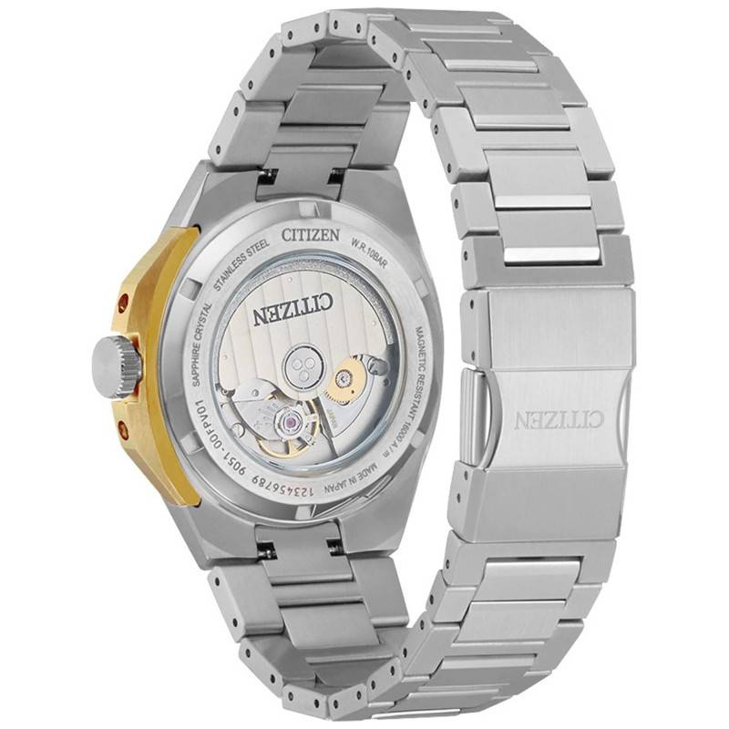 Au cœur de la Citizen Series 8 se loge un mouvement automatique Citizen 9051, un garde-temps qui allie précision et fiabilité. Ce mécanisme japonais est reconnu pour sa performance impeccable, battant à une fréquence de 28.800 alternances par heure, assurant une exactitude remarquable à chaque instant. Doté d'une réserve de marche généreuse de 42 heures, ce mouvement offre à l'utilisateur une flexibilité considérable sans craindre que la montre ne s'arrête si elle n'est pas portée durant quelques jours. La masse oscillante visible à travers le fond transparent de la montre ajoute non seulement une dimension esthétique mais aussi un intérêt technique.