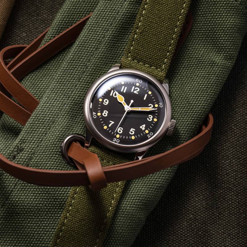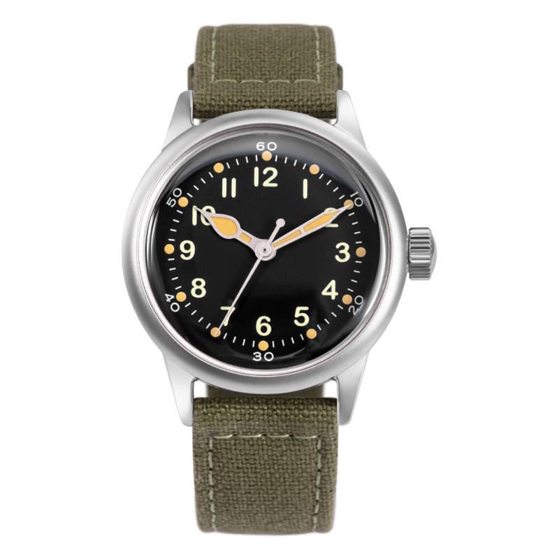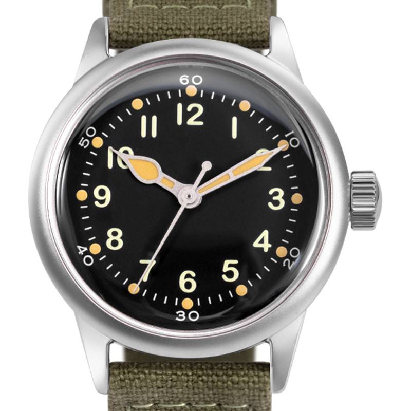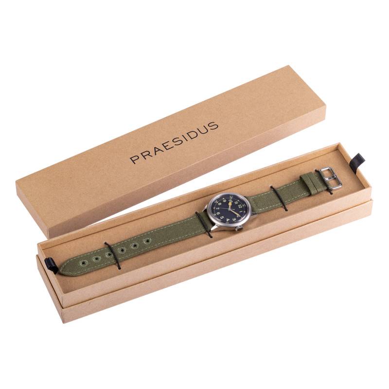 Praesidus est une marque fondée au cours du 20ᵉ siècle. Elle s'est rapidement imposée grâce à ses montres de très haute qualité et ultra-performantes. Elle puise dans le riche héritage de la tradition horlogère suisse pour vous offrir des garde-temps élégants. C'est le cas de ce superbe modèle Service Watch P-38-MB-E inspiré des exigences originales de la US Mil-Spec de 1942. Il séduit par sa simplicité et honore l'excellence de la manufacture. Son boîtier rond est conçu en acier chirurgical et est sublimé par une finition sablée. Il mesure 38 mm de diamètre pour une épaisseur de 12,50 mm. Avec son design moderne, il viendra magnifier le poignet des hommes. C'est un verre minéral de traitement saphir double dôme qui recouvre et protège le cadran des chocs. Son revêtement antireflet assure une lisibilité parfaite des indicateurs sous tous les angles. Ces derniers sont réglés par la couronne crantée qui se place à 3 heures. Pour finir, le fond de boîte garantit une étanchéité de 5 ATM.