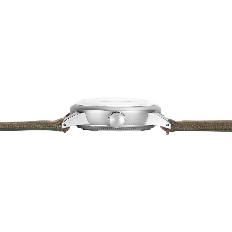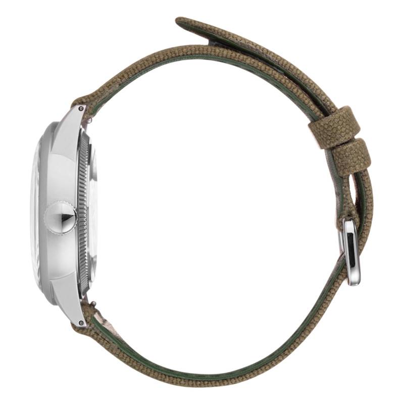 Pour compléter le look de cette montre, la marque a choisi un bracelet en toile de couleur kaki. Souple et confortable, il viendra épouser les courbes de votre poignet pour un look unique. Créant le parfait contraste avec le cadran, il se trouve longé de surpiqûres assorties. Son entre-corne mesure 20 mm et il se referme à l'aide d'une boucle ardillon.