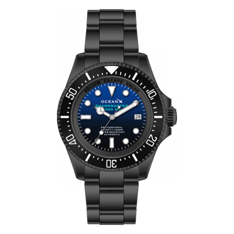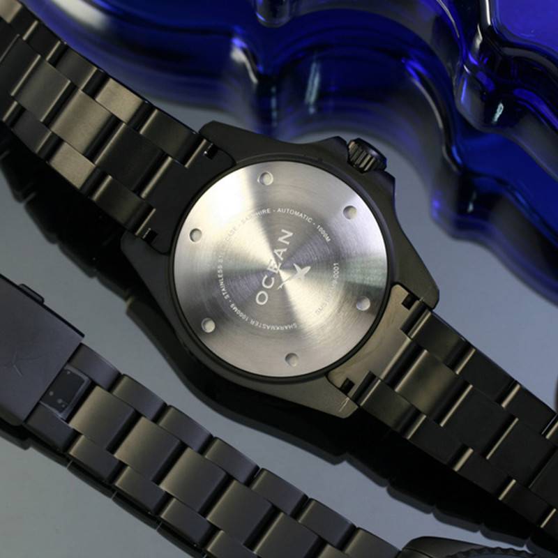 La montre OceanX Sharkmaster 1000 M9 incarne l'excellence en matière d'horlogerie dédiée aux activités aquatiques les plus exigeantes. Conçue pour les plongeurs professionnels, elle affiche un boîtier de forme ronde mesurant 44 mm de diamètre et une épaisseur de 14,85 mm. Fabriqué en acier inoxydable et revêtu d'un traitement DLC noir, ce boîtier robuste présente une finition sablée qui lui confère une allure moderne et sophistiquée. Sa construction massive lui assure une solidité à toute épreuve, avec un poids notable de 220 g contribuant à sa présence indéniable au poignet. La couronne vissée et le fond vissé garantissent une étanchéité parfaite, essentielle pour une montre conçue pour supporter l'immersion jusqu'à 100 atmosphères. Son design est parfaitement équilibré, entre raffinement et fonctionnalité exceptionnelle, avec une lunette en céramique unidirectionnelle, un choix judicieux pour résister à l'usure et aux rayures. Cette montre est équipée d'une valve à hélium, une caractéristique indispensable pour l'ajustement de la pression durant les plongées profondes, confirmant ainsi sa vocation de montre de plongée professionnelle.