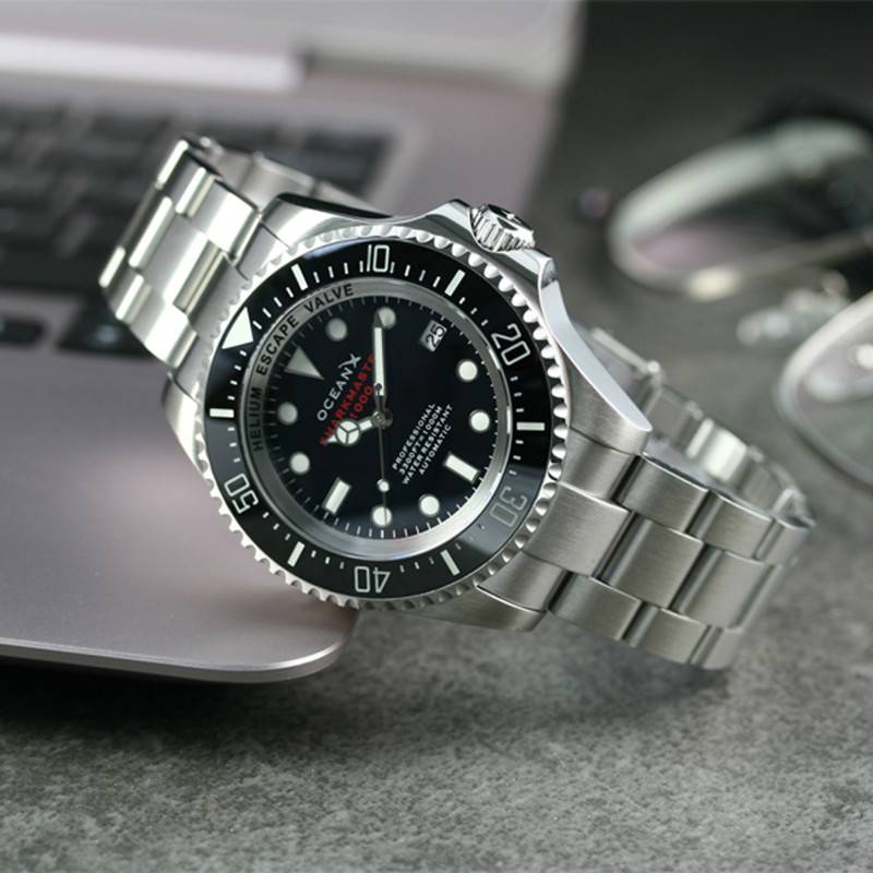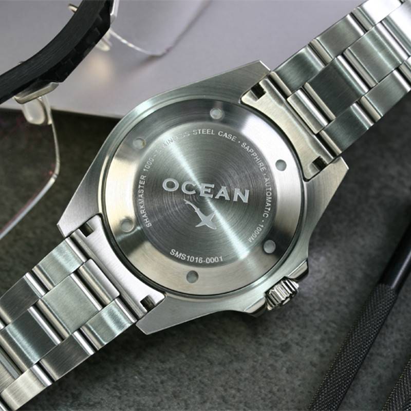 Ocean X est une marque jeune et dynamique qui s'est rapidement fait connaître pour son design exceptionnel et sa qualité de fabrication. Elle propose des garde-temps uniques et élégants avec une haute qualité de fabrication et une belle esthétique. Parmi ses impressionnantes créations, il y a la Sharkmaster 1000 SMS1011 qui une montre de plongée qui vous accompagnera sur terre et en mer. Ce modèle est doté d'un boîtier tonneau conçu en acier inoxydable argenté alternant des finitions polie et brossée. Imposant, il mesure 44 mm de diamètre et 16,10 mm d'épaisseur pour une longueur de corne à corne de 51,90 mm. Il comporte un verre saphir de 4,10 mm d'épaisseur résistant aux rayures qui est traité antireflet, ce qui offre une lisibilité optimale. Celui-ci est entouré par une jolie lunette parfaitement crantée faite en acier inoxydable et munie d'un insert en céramique noire. Unidirectionnelle, elle est marquée par une échelle des minutes et un repère luminescent. À 3 heures, se place la couronne crantée, siglée et protégée qui permet le réglage des aiguilles et de la date pour une lecture correcte. Sur le côté opposé, se trouve la valve d'échappement à hélium offrant une excellente résistance. L'ensemble est associé à un fond de boîte vissé et brossé mesurant 3,30 mm d'épaisseur qui promet une parfaite étanchéité de 100 ATM.
