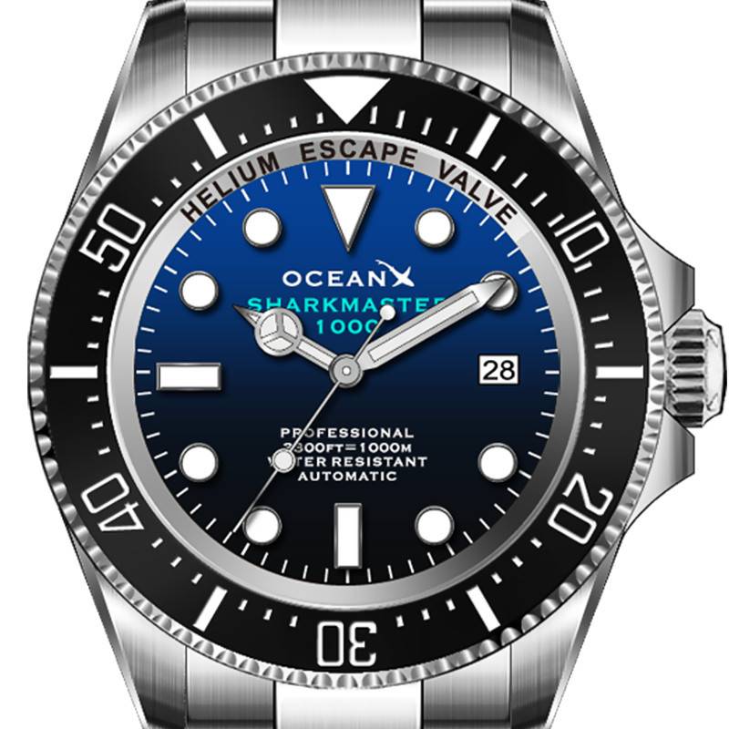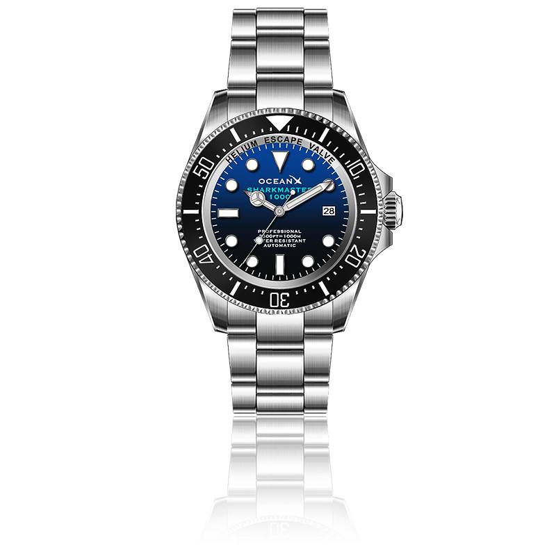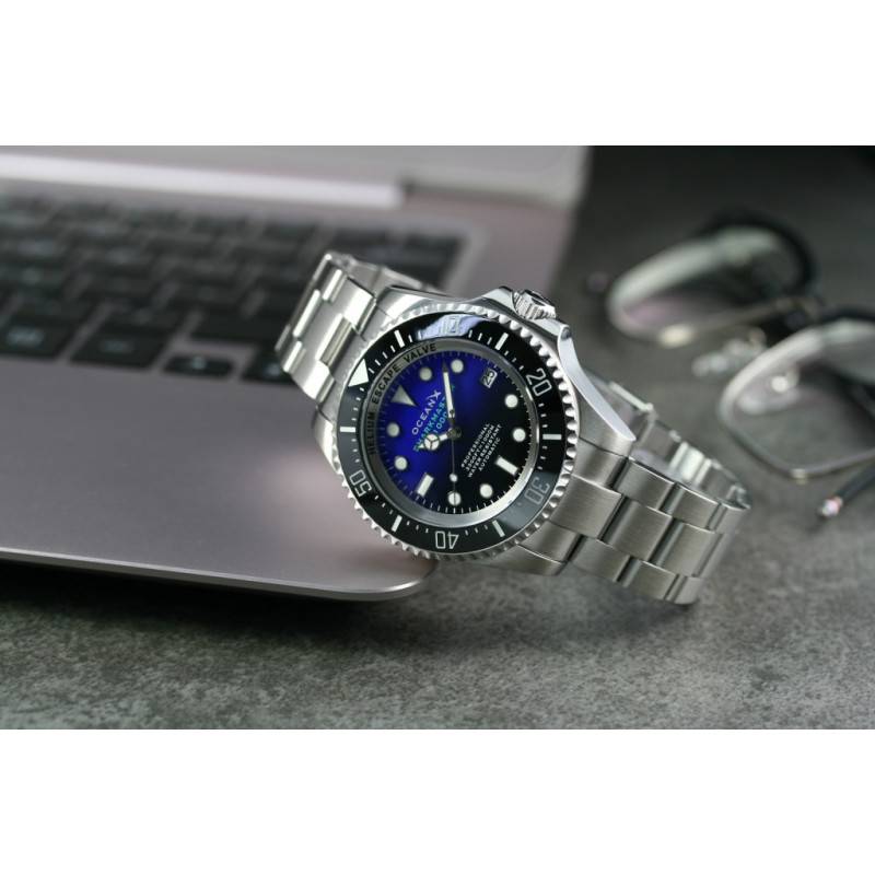 Ce garde-temps est habillé d'un somptueux cadran de forme ronde et doté d'un dégradé de couleur bleu et noir qui vous plongera au cœur des abysses. Il accueillera en son centre deux aiguilles de type Mercedes et une fine trotteuse. Ces marqueurs temporels indiqueront respectivement les heures, les minutes et les secondes. La marque joue sur les formes géométriques en proposant comme index des heures des cercles, des triangles et des rectangles. Ces divers indicateurs seront revêtus d'un traitement luminescent vous permettant de lire l'heure en milieu obscur. De plus, un guichet date situé à 3 heures viendra compléter votre lecture du temps. Le pourtour du cadran accueille un chemin de fer qui viendra préciser les minutes. De plus, OceanX annonce par écrit que le modèle détient une valve à hélium utile lors de la remontée des plongeurs. En effet, une surpression est possible, ce qui peut entraîner des dégâts au sein du boîtier. Cet outil sera donc un dégazage efficace contre cette problématique. Enfin, notez que la marque appose sa signature et le nom du modèle sous l'index de midi. Elle rappelle également son étanchéité à 6 heures.