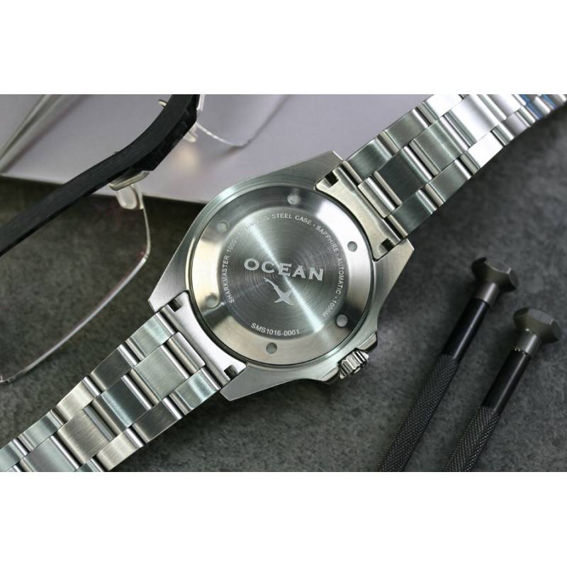 La marque OceanX vous dévoile un nouveau modèle issu de la collection Sharkmaster. Cette pièce horlogère fait donc partie de la collection iconique de la maison et vous dévoile une somptueuse montre plongeuse. La maison a choisi de moderniser le modèle intemporel que les amateurs d'horlogerie et des univers marins connaissent. Cette montre Sharkmaster 1000 SMS1012 possède un boîtier en acier de forme ronde, iconique des modèles de plongée, et affiche 44 mm de diamètre pour une épaisseur de 16,10 mm. Ce modèle imposant viendra parfaitement habiller votre poignet masculin. Une lunette unidirectionnelle noire en céramique viendra compléter le cadran. Cette matière viendra sublimer votre poignet au gré de vos mouvements. De plus, elle est graduée et possède au côté de sa finition cannelée une couronne remontoir à 3 heures. Cette dernière sera utilisée pour animer les aiguilles des heures, des minutes et des secondes. Enfin, votre lecture analogique de l'heure sera optimisée à travers un verre saphir situé au-dessus du cadran. Il est doté d'un traitement antireflet reconnu dans l'univers horloger. Son fond de boîte est vissé et vous garantira une étanchéité de 10 ATM.