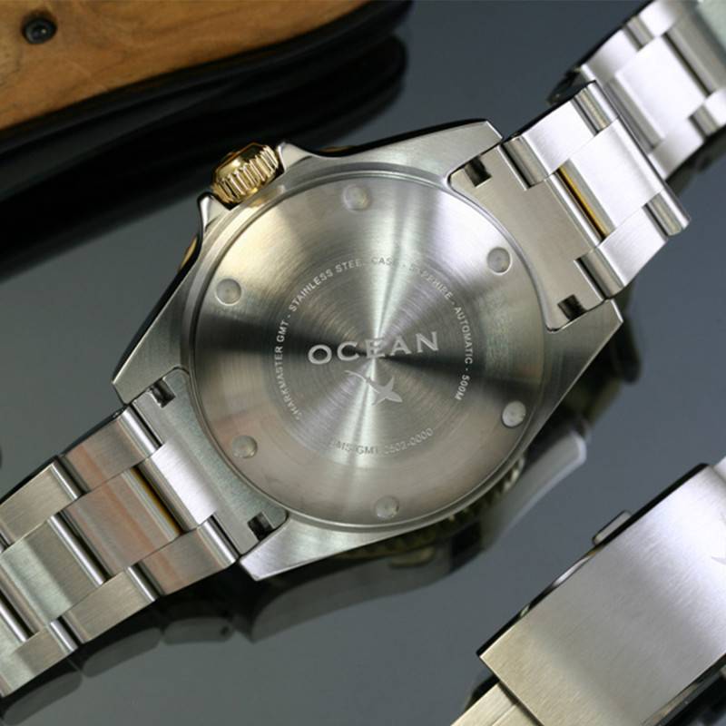 Dotée d'une capacité d'étanchéité à 50 ATM, cette montre OceanX Sharkmaster GMT est prête à supporter les pressions de l'eau, jusqu'à 50 mètres de profondeur. Conçu pour les amateurs de plongée et de sports nautiques, ce modèle offre ainsi non seulement l'assurance d'un fonctionnement impeccable sous l'eau mais également une robustesse qui saura résister aux situations extrêmes.