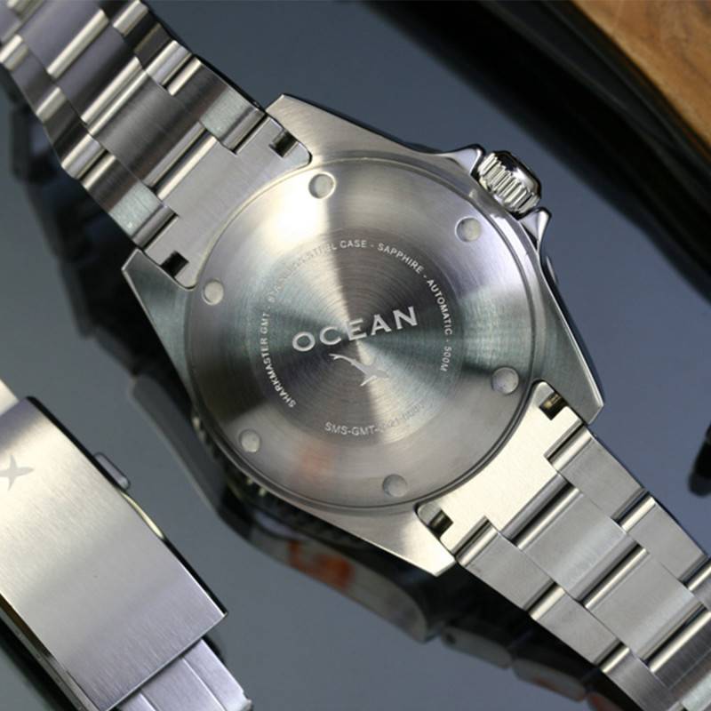 La montre OceanX Sharkmaster GMT se distingue par son allure à la fois sportive et sophistiquée, rendue possible grâce à l'acier inoxydable de haute qualité utilisé pour l'ensemble du boîtier. Affichant un diamètre de 40 mm et une épaisseur de 14,5 mm, elle se marie parfaitement avec la tendance actuelle des montres légèrement surdimensionnées, tout en restant d'une élégance admirable. La forme ronde du boîtier confère à cette montre une apparence classique, alors que la finition brossée et polie lui donne un aspect contemporain.