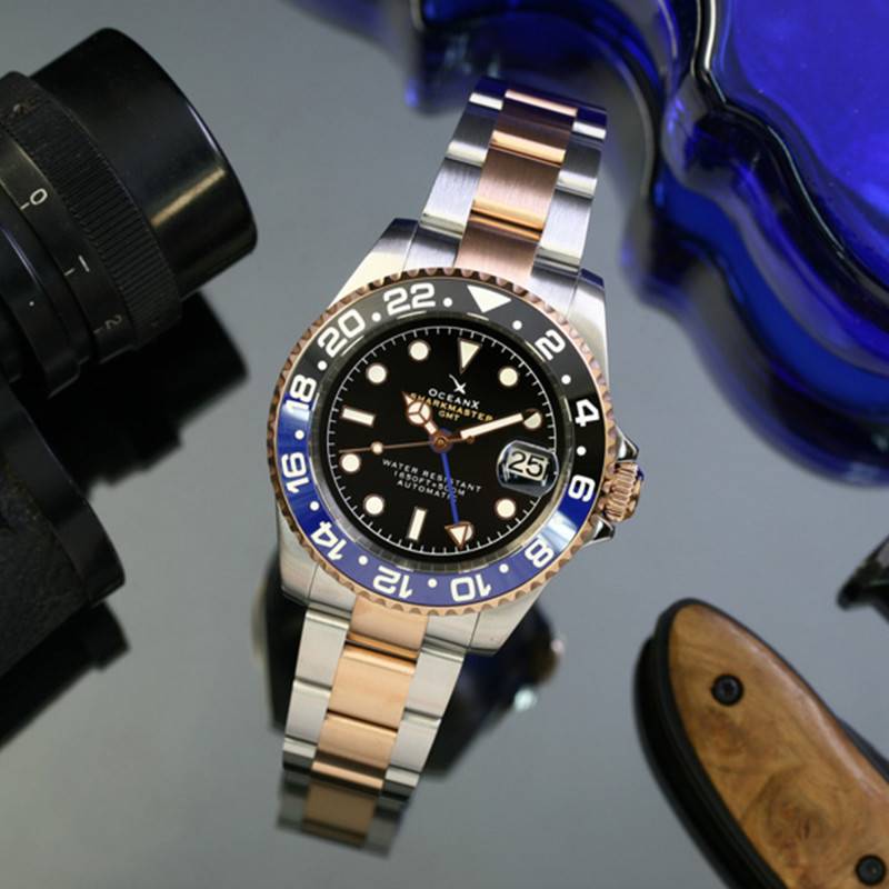 Le cadran noir de cette montre OceanX se distingue par sa clarté et son accessibilité. Il est protégé par un verre saphir plat qui a bénéficié d'un traitement antireflets, assurant une lecture optimale même sous une lumière intense. Les chiffres arabes et les index, tous luminescents, facilitent la lecture de l'heure. Le design inclut également un chemin de fer qui parcourt les minutes, apportant un niveau supplémentaire de précision visuelle. Un guichet de date est délicatement positionné à 3 h, intégrant pratique et esthétique. Les aiguilles analogiques, luminescentes elles aussi, glissent avec élégance sur ce cadran sophistiqué, fournissant une lecture claire et instantanée de l'heure, des minutes et des secondes. L'affichage GMT, qui permet de suivre un second fuseau horaire, accentue la fonctionnalité de ce garde-temps.
