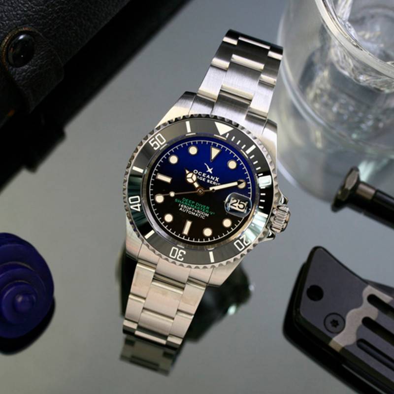 Le cadran de cette montre OceanX capte immédiatement le regard par sa teinte bleue profonde, un choix de couleur qui évoque les vastes océans. Il est complété par des index et des chiffres arabes luminescents, offrant une lisibilité optimale dans toutes les conditions d'éclairage. Le chemin de fer des minutes est un ajout subtil qui renforce la précision de lecture. Les aiguilles sont également pourvues d'une matière luminescente, garantissant une vision claire de l'heure même dans l'obscurité la plus totale. Le guichet date, situé à 3 heures, s'intègre harmonieusement au design du cadran, fournissant une fonctionnalité supplémentaire appréciée des professionnels.