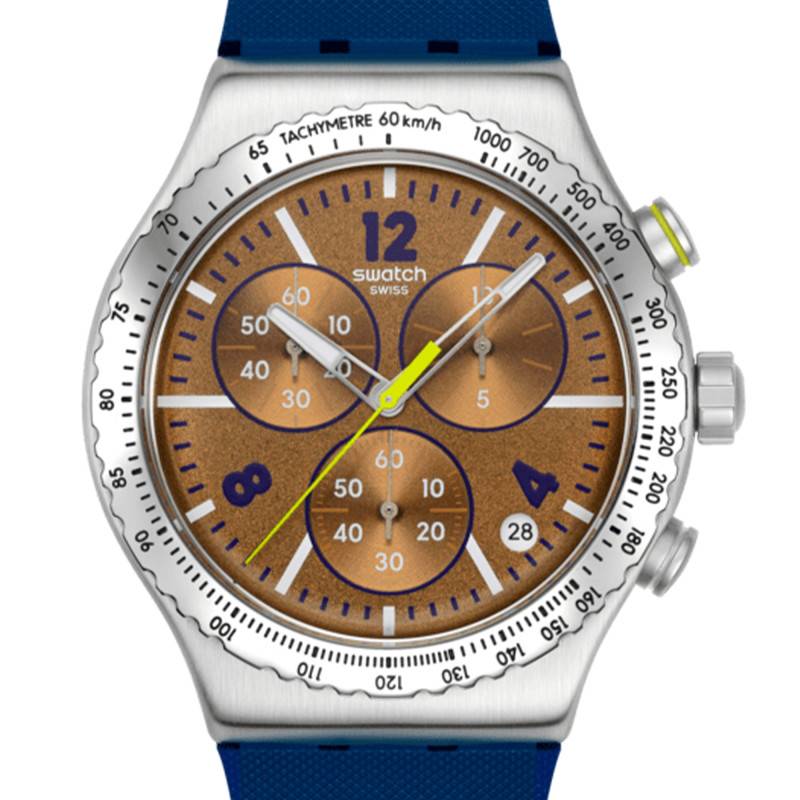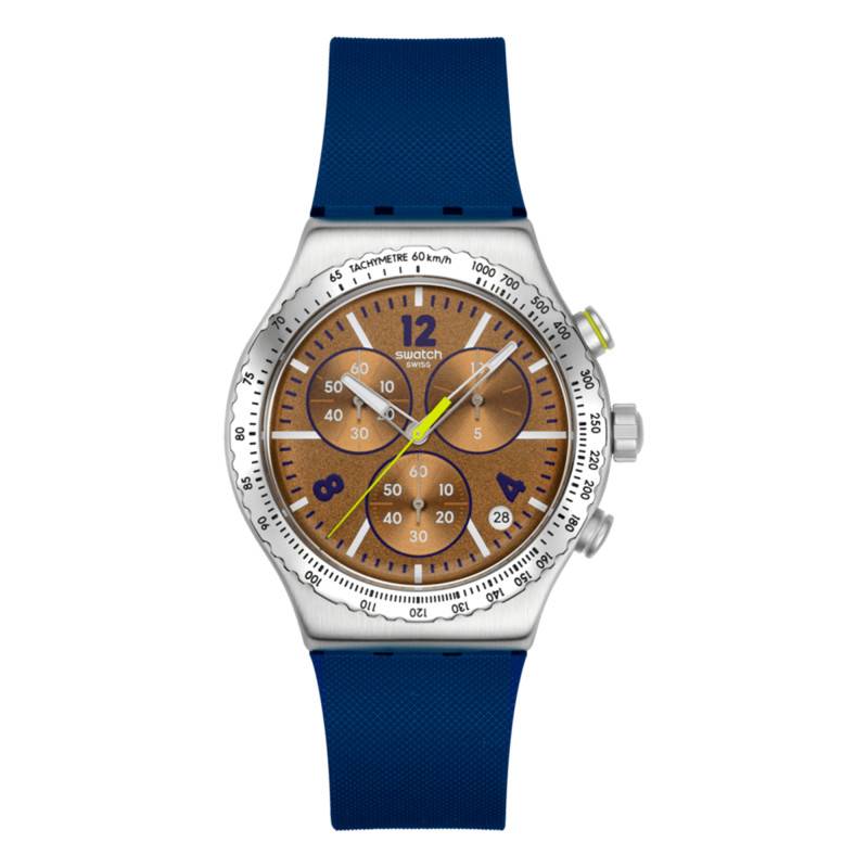 La Sidereal Glow YVS534 de Swatch est un parfait exemple de l'expertise suisse en matière d'horlogerie. La montre est dotée d'un boîtier rond de 43 mm en acier inoxydable, une matière reconnue pour sa résistance et sa durabilité exceptionnelles. Arborant une finition polie et brillante, elle se distingue par son apparence moderne et élégante. Le poids du boîtier, 84 grammes, confère une sensation de solidité sans compromettre le confort au poignet. Face avant, l'échelle tachymétrique gravée sur la lunette permet des mesures de vitesse très précises, essentielles pour les amateurs de fonctionnalité.