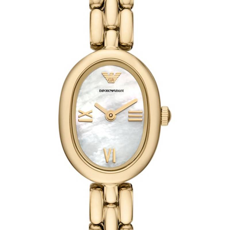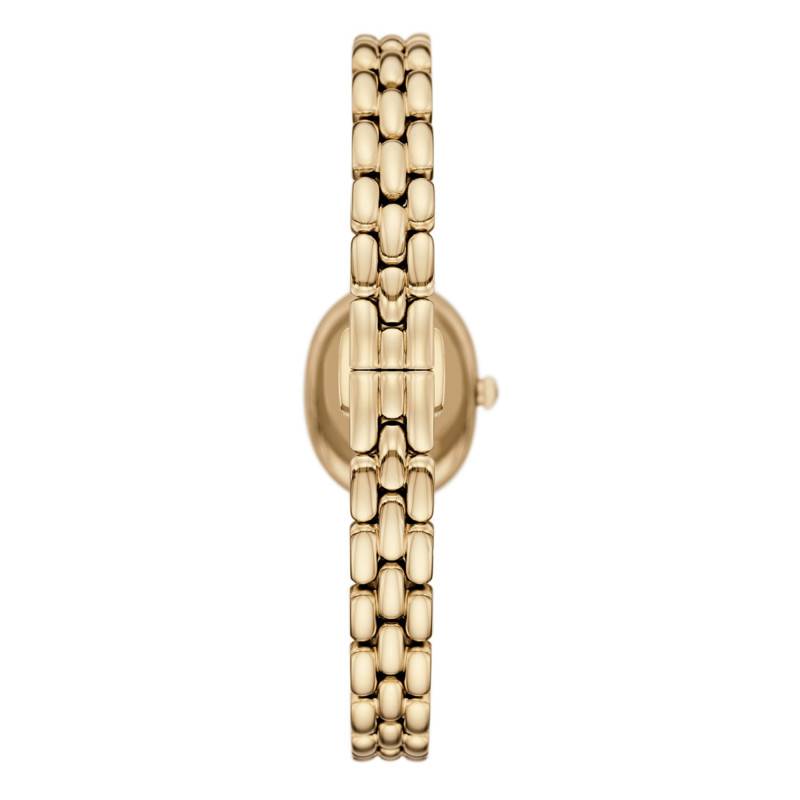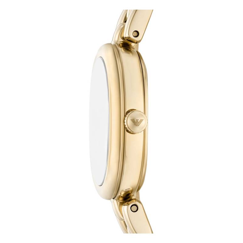 La montre Emporio Armani de la collection Sinfonia se distingue par son design intemporel et sa qualité de fabrication exquise. Le boîtier ovale de cette montre est fabriqué en acier inoxydable de haute qualité, avec une finition en PVD jaune qui lui confère un éclat doré sublime. Le diamètre de ce boîtier est de 18 mm, tandis que l'épaisseur est de 6 mm, ce qui lui assure une présence délicate et féminine au poignet sans alourdir la silhouette. La montre est dotée d'un verre minéral plat, réputé pour sa résistance et sa capacité à préserver l'intégrité du cadran.