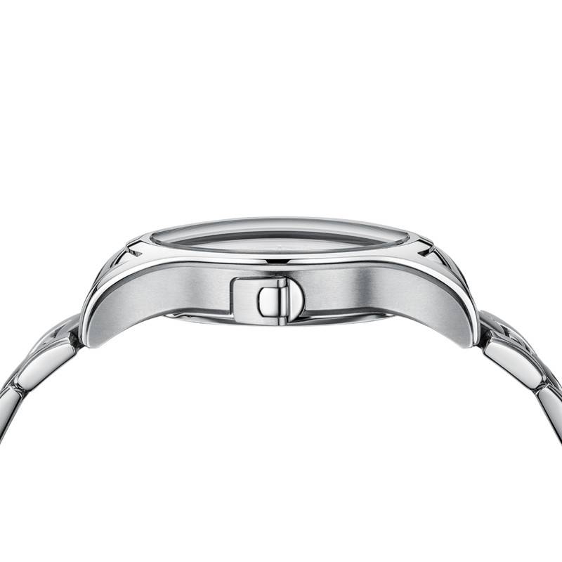 Le bracelet en cuir d'alligator noir, véritable, confère à cette montre un attrait classique et luxueux. Douce au toucher et élégamment surpiquée, sa couleur profonde contraste superbement avec le boîtier. Ce bracelet est complété par une boucle déployante argentée, assurant confort et sécurité au porté. De plus, un second bracelet en acier inoxydable aux finitions polies et brossées est offert pour l'achat de cette montre.