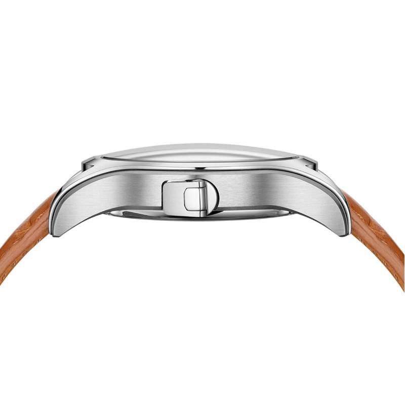 Le bracelet de cette montre est une alliance parfaite entre luxe et confort. Fabriqué en cuir d'alligator véritable de couleur marron, il offre non seulement un toucher exceptionnel mais s'adapte aussi parfaitement à votre poignet. Les surpiqûres visibles ajoutent une dimension artisanale et soulignent le savoir-faire traditionnel de la maison Cuervo y Sobrinos. Ce bracelet est fermé par une boucle déployante en acier inoxydable argenté, qui assure sécurité et élégance lorsque la montre est portée. La qualité du cuir garantit une durabilité exemplaire tout en offrant un confort supérieur, même lors d'une utilisation prolongée. Son design classique et intemporel complète à merveille l'esthétique générale de la montre, faisant de cet accessoire une pièce non seulement luxueuse, mais également pratique. De plus, un second bracelet en acier inoxydable aux finitions polies et brossées est offert pour l'achat de cette montre.