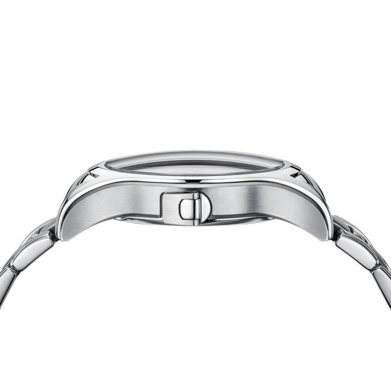 Le bracelet en cuir d'alligator marron confère à cette montre une touche de sophistication inégalée. Ce matériau noble et luxueux est accentué par de délicates surpiqûres, ajoutant une nuance supplémentaire de raffinement au design global. La sensation de confort est accompagnée par l'assurance d'un maintien sécurisé grâce à une boucle déployante argentée, réputée pour sa praticité et son élégance. De plus, un second bracelet en acier inoxydable aux finitions polies et brossées est offert pour l'achat de cette montre.