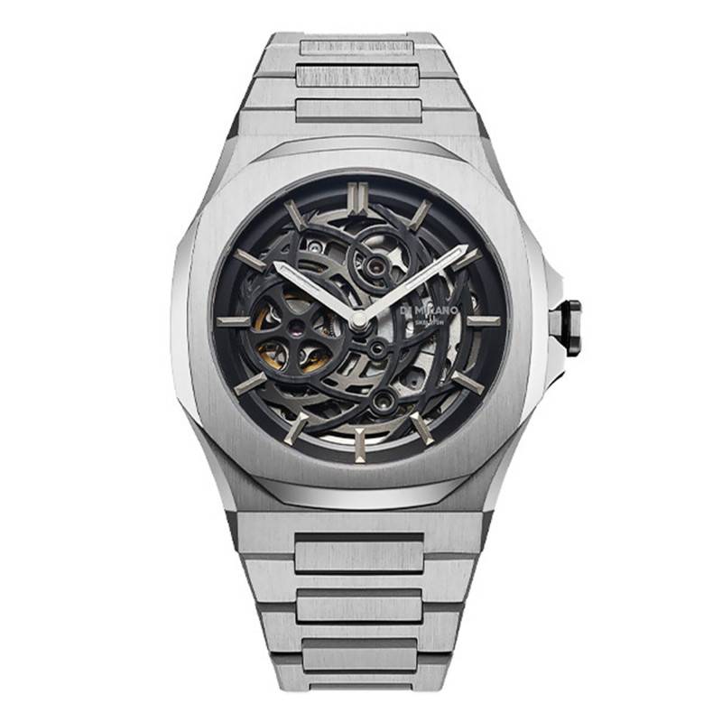 La maison D1-Milano vous propose sa nouvelle montre SKBJ10 issue de la collection skeleton qui nous laisse une vue imprenable sur le mouvement de cette montre et sur ses rouages. Elle possède un boîtier de forme octogonale plutôt original. Il affiche des dimensions de 41.5 millimètres de diamètre pour une épaisseur de 11 millimètres. Son boîtier est conçu en acier inoxydable 316 L ce qui le rend plus robuste. Au-dessus de ce cadran vient se positionner un verre saphir qui le protègera des imprévues, ce verre est doté d'un traitement antireflet et vous permettra d'admirer ce cadran même sous une forte luminosité. À droite de ce boîtier vous retrouverez une couronne remontoir qui vous permettra de régler les aiguilles des heures et des minutes manuellement. Enfin, la marque équipe cette montre d'un fond de boîte maintenue par des vis et transparent ce qui lui procure une étanchéité de 5 ATM ce qui équivaut jusqu'à 50 mètres de profondeur.