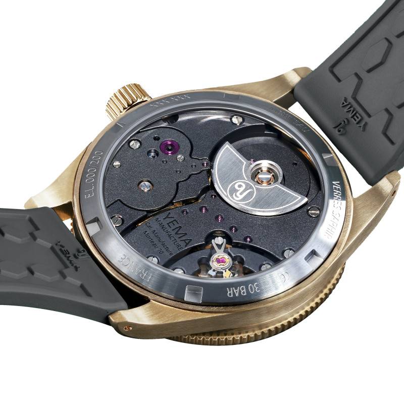 Au cœur de cette montre se trouve un mécanisme automatique de haute précision, propre à la maison Yema et fabriqué avec expertise en France. Ce moteur horloger, d'une réserve de marche de 70 heures, est conçu pour offrir une performance fiable et durable. Il intègre une masse oscillante, caractéristique des mouvements automatiques, garantissant un remontage optimal avec le simple geste du poignet. S'ajoute à cela la couronne vissée qui renforce non seulement l'étanchéité mais aussi assure un remontage manuel aisé lorsque nécessaire. La précision du mécanisme français assure que chaque seconde est mesurée avec exactitude, faisant de cette montre un compagnon de confiance pour le quotidien comme pour vos aventures les plus audacieuses.