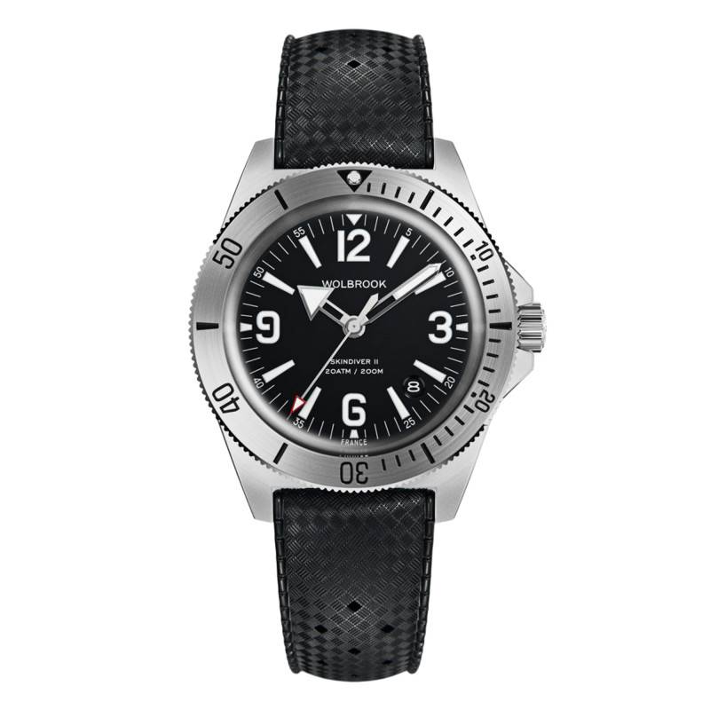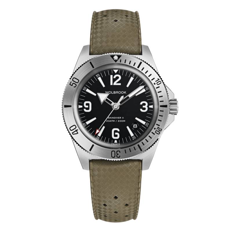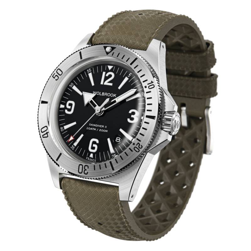 La Skindiver II Automatic se distingue également par la diversité de ses bracelets, offrant ainsi une adaptabilité inégalée. Elle est proposée avec trois options de bracelet qui peuvent être sélectionnées via un menu déroulant : un bracelet en caoutchouc noir, un autre en caoutchouc vert kaki, et un troisième en acier inoxydable 316 L brossé. Chacun de ces bracelets confère un style distinct, du look sportif à une allure plus classique. L'entrecorne mesure 20 mm, avec un fermoir en boucle ardillon ou une boucle déployante, pensés pour garantir un confort optimal et une sécurité sur le poignet dans toutes les situations.