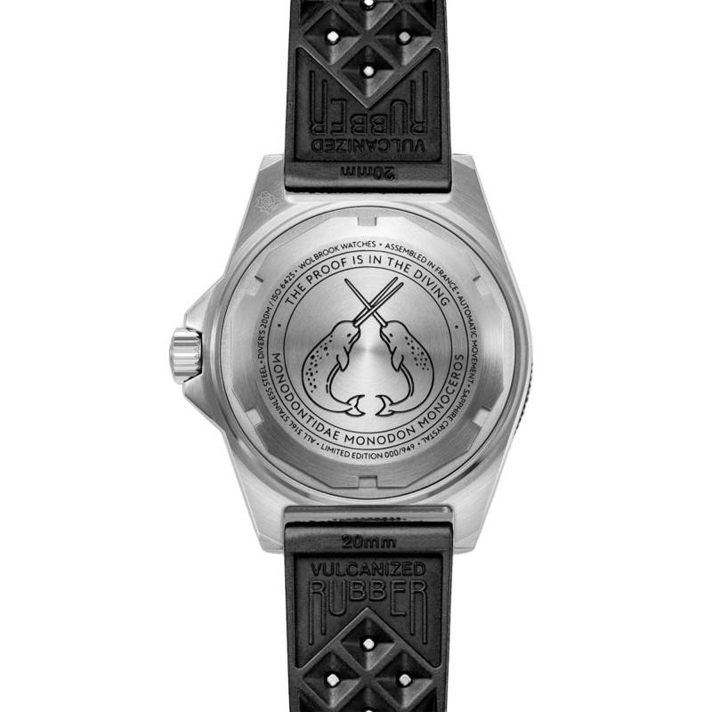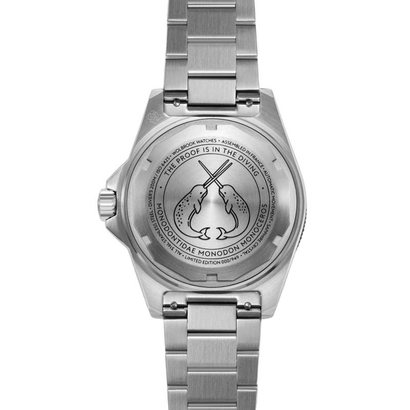 La montre Skindiver II Automatic Dive incarne l'essence de l'horlogerie de précision avec son design fonctionnel et raffiné. Fabriquée en France, cette montre arbore un boîtier rond en acier inoxydable 316L, reconnu pour sa robustesse et sa résistance. D'un diamètre de 40 mm et d'une épaisseur de 12,70 mm, elle est conçue pour s'adapter à tous les poignets masculins avec une touche d'élégance discrète. Le boîtier présente une finition mate (brossée/satinée) qui lui confère un aspect moderne et épuré. Sa couronne et son fond vissés garantissent une étanchéité à 20 ATM, permettant une immersion jusqu'à des profondeurs significatives. Ce garde-temps, en édition limitée, offre une touche d'exclusivité, avec son fond de boîte numéroté et gravé, affichant le légendaire motif "The Proof Is In The Diving", accompagné d'une illustration de narvals gravés en profondeur.