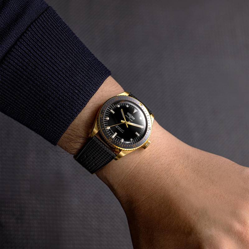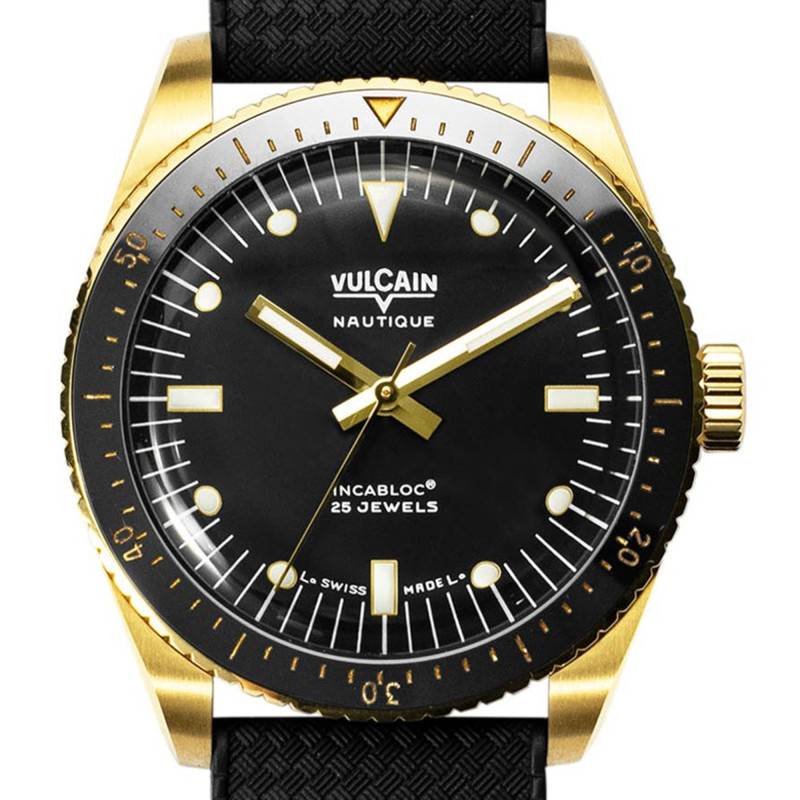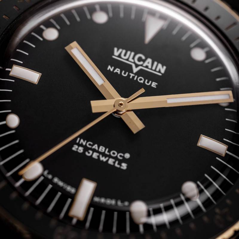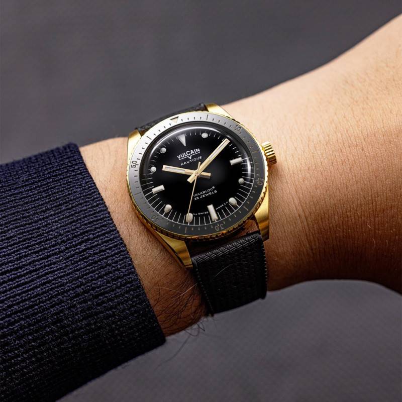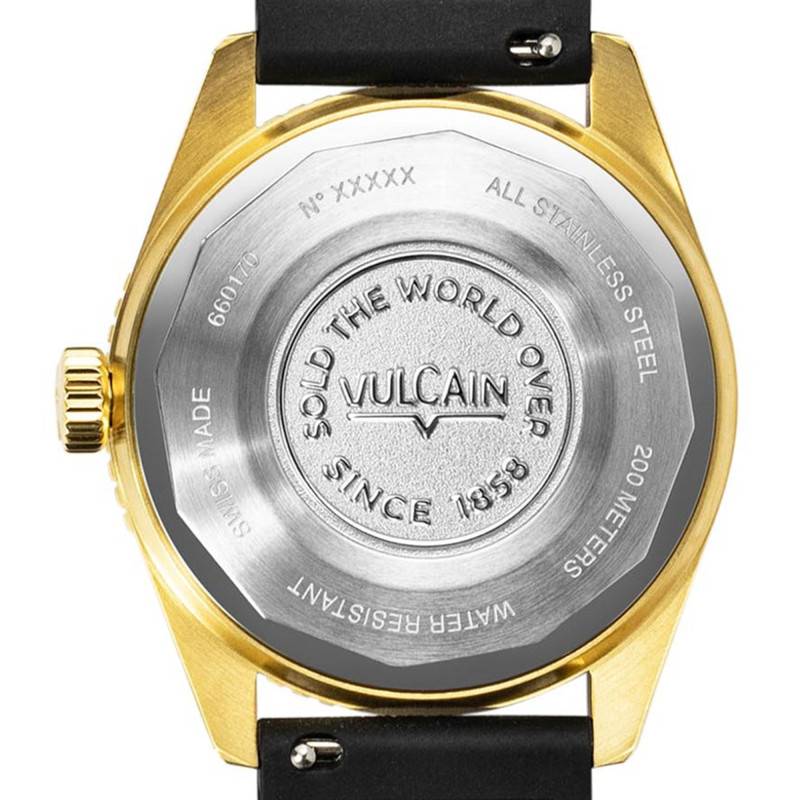 Fort d'un riche patrimoine, Vulcain continue à se tourner vers l'avenir. Fondée en 1858, elle propose des garde-temps mécaniques de haute qualité avec des innovations exceptionnelles conçus en interne. Afin de vous proposer des modèles performants et parfaitement équipés, la manufacture Vulcain réédite une montre de plongée iconique datant des années 1960 sous le nom de Skin Diver 661170A07. C'est un modèle fiable et solide doté d'un boîtier conçu en acier inoxydable robuste, bien proportionné et sérieusement construit. Celui-ci est rehaussé par un revêtement jaune doré et présente une alternance de finitions polies et brossées offrant un look sophistiqué. Il affiche une allure vintage qui est mise en avant par une forme ronde et un diamètre de 38 mm pour une épaisseur de 12,20 mm. Celle-ci est renforcée par un verre saphir bombé qui protège le cadran des rayures. La lunette crantée et tournante accorde une allure contemporaine en plus d'un look sportif. Elle est munie d'un insert en céramique noire souligné par un chemin de fer des minutes et un repère triangulaire à 12 heures. Bien équilibrée, la carrure s'associe à une couronne crantée et dorée qui permet le réglage facile des aiguilles des heures et des minutes pour un chronométrage précis. Le tout est complété par un fond de boîte vissé et gravé qui promet une étanchéité de 20 ATM.