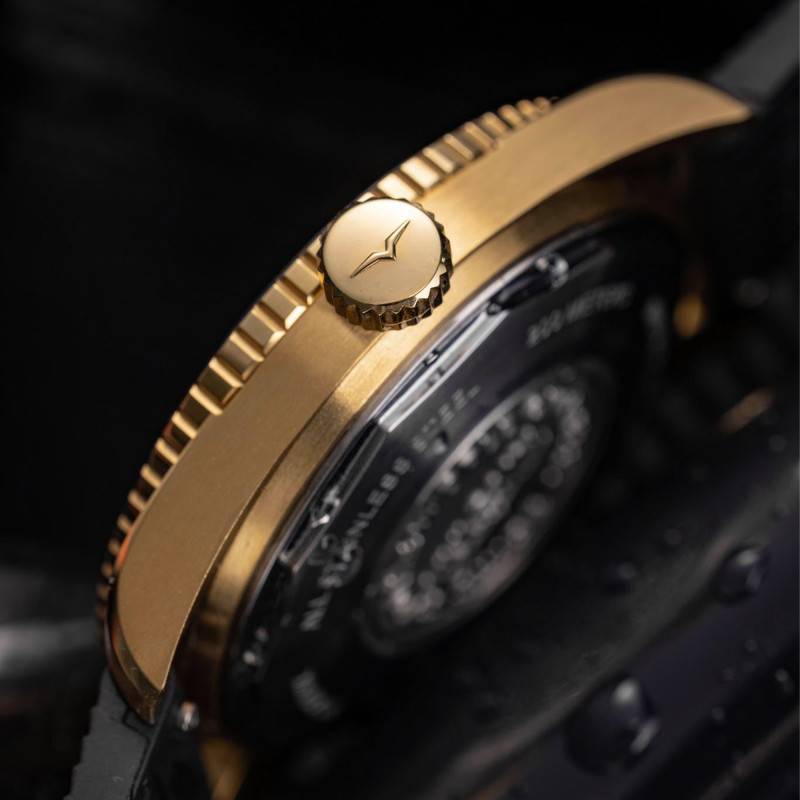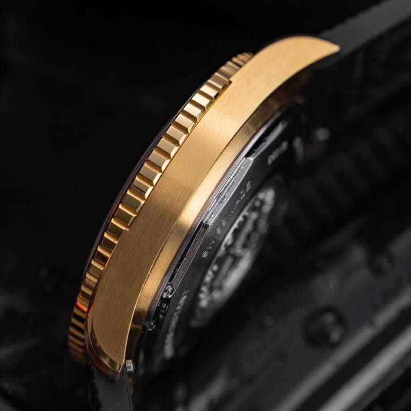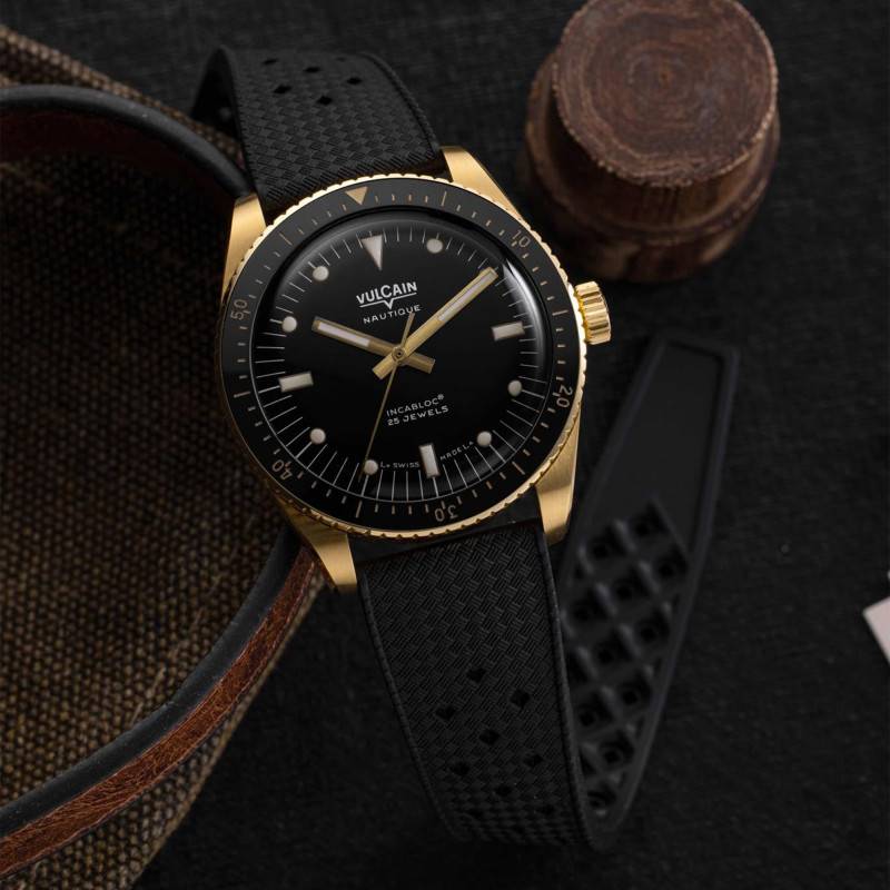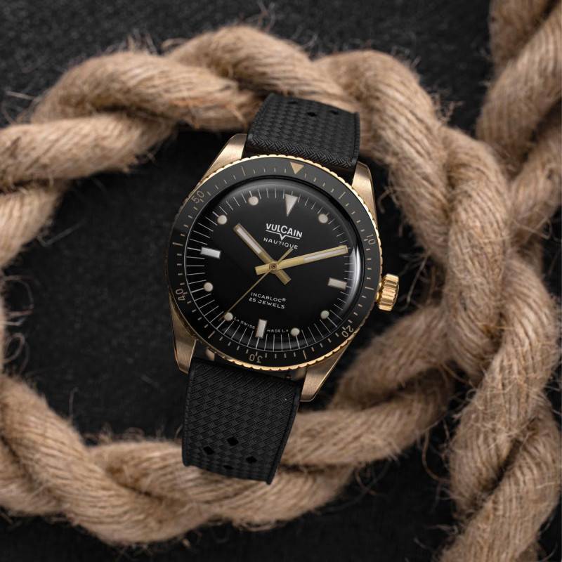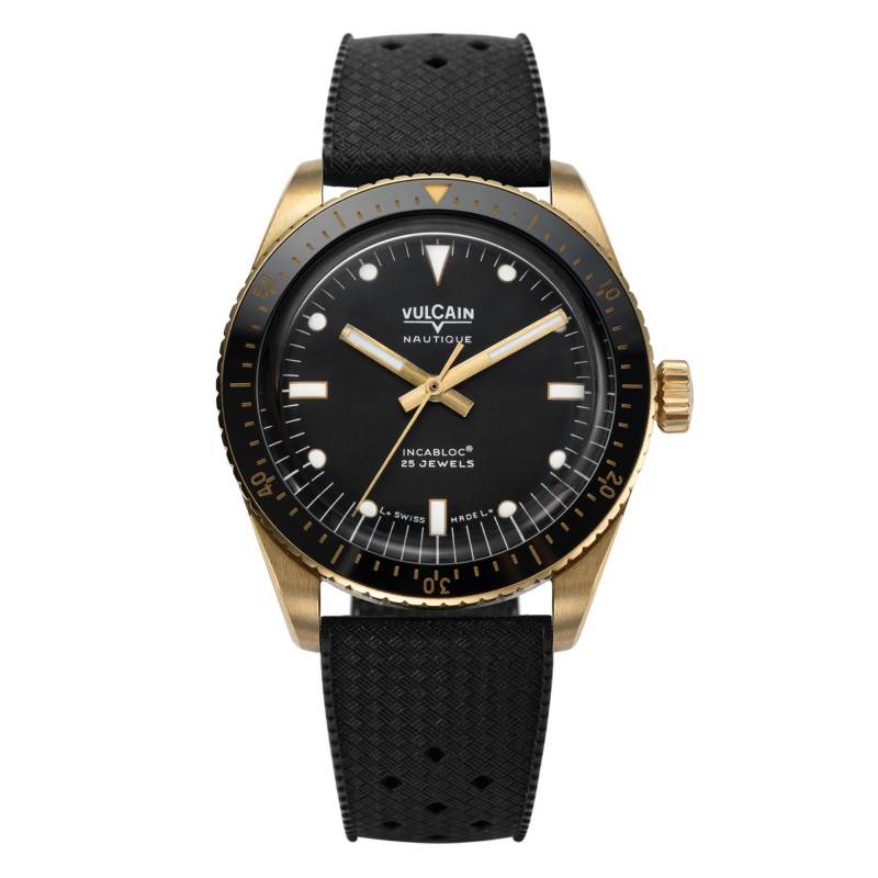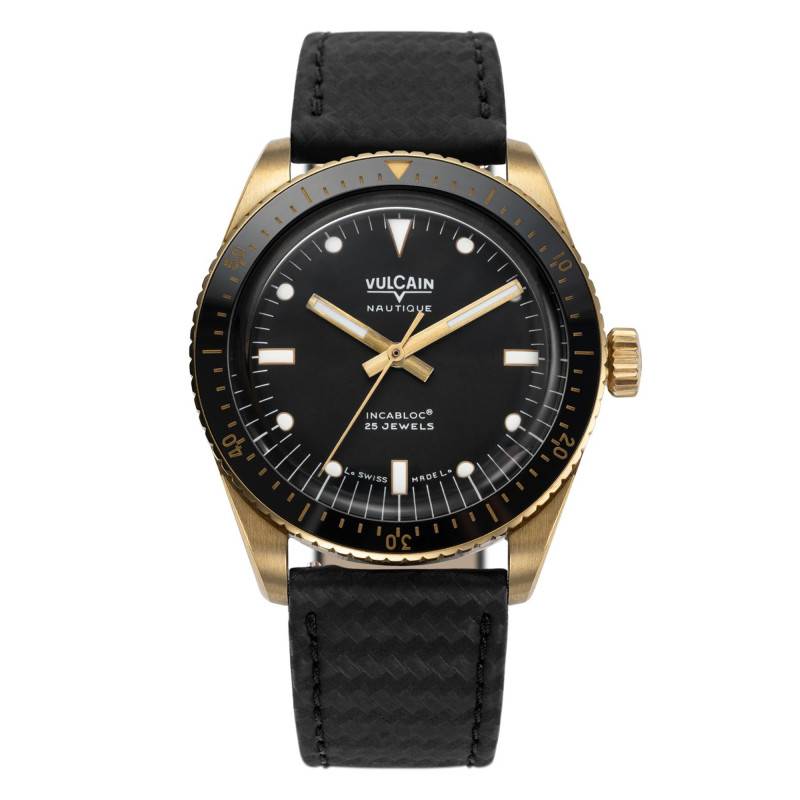 Fort d'un riche patrimoine, Vulcain continue à se tourner vers l'avenir. Fondée en 1858, elle propose des garde-temps mécaniques de haute qualité avec des innovations exceptionnelles conçus en interne. Afin de vous proposer des modèles performants et parfaitement équipés, la manufacture Vulcain réédite une montre de plongée iconique datant des années 1960 sous le nom de Skin Diver 661170A07. C'est un modèle fiable et solide doté d'un boîtier conçu en acier inoxydable robuste, bien proportionné et sérieusement construit. Celui-ci est rehaussé par un revêtement jaune doré et présente une alternance de finitions polies et brossées offrant un look sophistiqué. Il affiche une allure vintage qui est mise en avant par une forme ronde et un diamètre de 38 mm pour une épaisseur de 12,20 mm. Celle-ci est renforcée par un verre saphir bombé qui protège le cadran des rayures. La lunette crantée et tournante accorde une allure contemporaine en plus d'un look sportif. Elle est munie d'un insert en céramique noire souligné par un chemin de fer des minutes et un repère triangulaire à 12 heures. Bien équilibrée, la carrure s'associe à une couronne crantée et dorée qui permet le réglage facile des aiguilles des heures et des minutes pour un chronométrage précis. Le tout est complété par un fond de boîte vissé et gravé qui promet une étanchéité de 20 ATM.