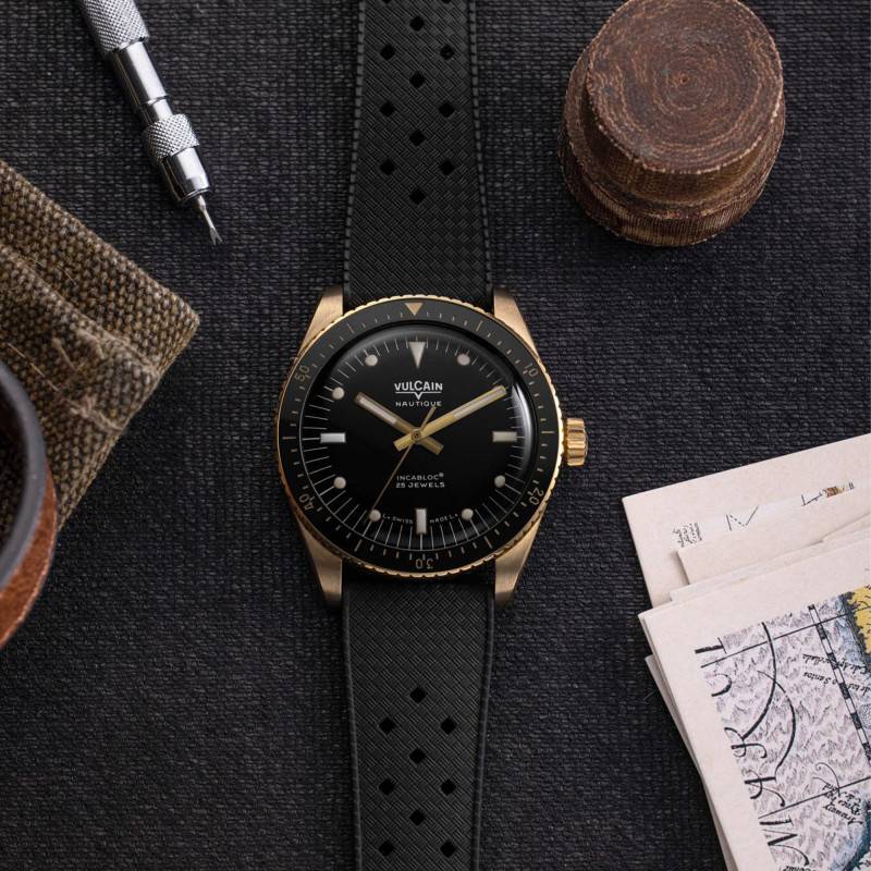Le premier bracelet est conçu en caoutchouc noir de type Tropic. Perforé, il assure un port confortable et souple autour du poignet en plus d'un look plus sportif.