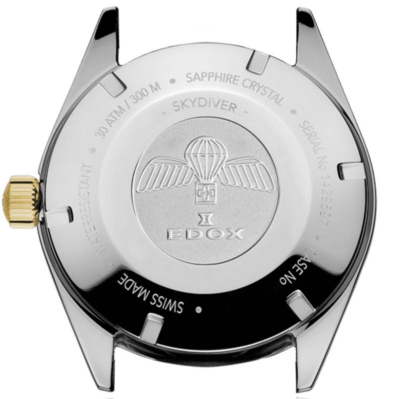 Edox a été créée en 1884 en Suisse. Elle confectionne des garde-temps haut de gamme arborant des designs élégants et dotés de technologies avancés pour vous proposer le meilleur. Découvrez la collection Skydiver qui a connu un grand succès dans les années 60 grâce aux montres arborant un look sportif et faites avec la plus grande précision. Aujourd'hui, cette ligne est revisitée et la marque propose en édition spéciale cette Skydiver 80131 357JNC BI qui est adaptée aussi bien aux poignets des hommes qu'à celui des femmes en quête de distinction. Elle est munie d'un boîtier plus petit que celui de la version initiale mesurant 38 mm de diamètre, 13,70 mm d'épaisseur et 89 grammes. Afin de vous accompagner dans les fonds marins, elle présente une lunette unidirectionnelle d'aspect cranté en acier inoxydable de traitement PVD or jaune affichant un insert céramique noire. Elle est marquée par un chemin de fer des minutes et un repère luminescent qui vous serviront de compte à rebours. Elle encercle un verre saphir bombé qui protège le cadran contre les rayures et qui apporte une touche vintage au design. Sur le côté droit du boîtier, une couronne crantée prend sa place à 3 heures. Elle est vissée et se caractérise par un double O'ring qui lui permet d'augmenter la résistance à la pression de l'eau. Cette dernière vous permet de régler les heures, les minutes et la date selon votre convenance. Pour ce qui est du fond de boîte, il est vissé et représente fièrement l'emblème d'une unité de parachutistes. Il promet une étanchéité de 30 ATM.