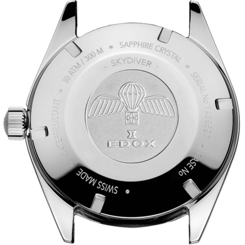 Edox est une marque d'horlogerie suisse qui a été créée en 1884 et qui propose de belles montres de plongée à chaque nouvelle collection. Ces dernières font preuve d'un savoir-faire suisse et sauront parer votre poignet avec élégance et prestance tout en communiquant le temps avec facilité. Edox lance la célèbre SkyDiver avec des modèles en édition spéciale dont la montre Skydiver 80131-3NC-NDRO. Cette gamme conçue initialement dans les années 60 rendait hommage aux parachutistes et aux conditions extrêmes auxquelles ils pourraient être confrontés. Le modèle que nous vous présentons est doté d'un boîtier rond plus petit que l'original avec un diamètre de 38 mm, une épaisseur de 13,70 mm et un poids de 89 grammes qui conviendra aussi bien aux poignets féminins que masculins. Celui-ci est fabriqué en acier inoxydable et se compose d'une lunette unidirectionnelle affichant un insert en céramique noir marqué par un compte à rebours et un repère luminescent. Afin de protéger les éléments centraux des chocs pouvant nuire à leur esthétique, un verre saphir bombé protège efficacement le cadran contre les rayures. Ces éléments seront manipulés par la couronne crantée et vissée munie d'un double O'ring. Ce dernier lui permet d'avoir une grande résistance à la pression de l'eau. Pour finir, le fond de boîte également vissé promet une étanchéité de 30 ATM. Ce fond poli porte la gravure d'un parachute ainsi que le logo et le nom de la marque.