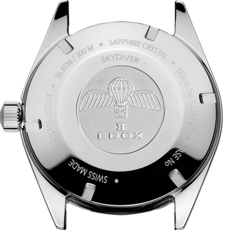 Edox est une marque d'horlogerie suisse qui excelle dans le domaine depuis 1884. Elle propose des garde-temps haut de gamme spécialement conçus pour la plongée et arborant des designs impressionnants qui sauront vous enchanter. Elle dévoile la montre Skydiver 80131-3NC-VI en édition spéciale qui est réédition de l'une de ses iconiques montres qui a connu un franc succès. Ce modèle est proposé avec un boîtier de 38 mm de diamètre, 13,70 mm d'épaisseur et 89 grammes. Convenant parfaitement aux poignets masculins et féminins, il saura apporter la touche finale élégante à votre tenue et parera votre poignet avec confort grâce à ses cornes incurvées. Il arbore une forme ronde et pour une grande robustesse dans le temps, il est conçu en acier inoxydable poli. Afin de vous permettre de calculer le temps écoulé lors de l'immersion, il est muni d'une lunette crantée unidirectionnelle affichant un insert en céramique noire marqué par un chemin de fer et un repère luminescent. Quant à sa surface, elle est recouverte par un verre saphir bombé qui protège le cadran des rayures. Le réglage de ses éléments se fera au moyen d'une couronne crantée volumineuse présentant un aspect cranté pour une bonne prise en main. Vissée, elle possède un double joint torique qui lui permet d'augmenter la résistance à la pression de l'eau. Enfin, le fond de boîte est vissé et comporte une belle gravure d'un parachute sur le centre brossé. Ce fond promet une étanchéité de 30 ATM.