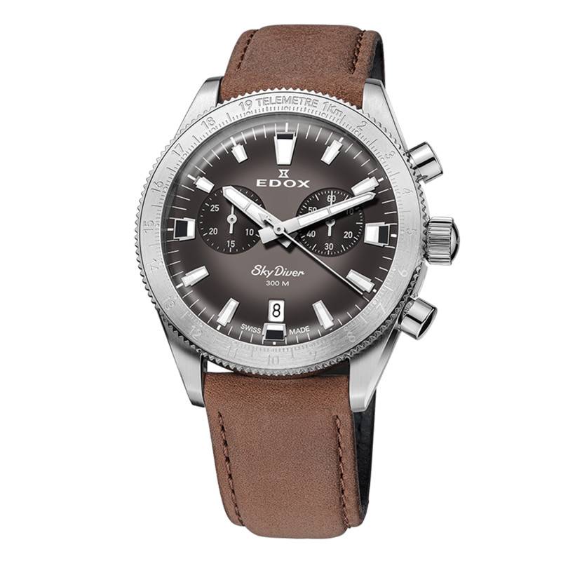 La Skydiver Chronograph est livrée avec non pas un, mais deux bracelets, accentuant sa polyvalence. Le bracelet principal en acier inoxydable arbore une finition subtilement brossée et polie, correspondant parfaitement à l'élégance de la montre. En complément, un bracelet en cuir de bovin de couleur marron est inclus, permettant une transformation facile de son style, de l'élégance décontractée à une allure plus classique et raffinée grâce à la surpiqûre qui ajoute une touche artisanale. Les fermetures, constituées d'une boucle ardillon ou d'une boucle déployante double, garantissent un ajustement sûr et confortable.