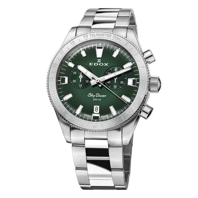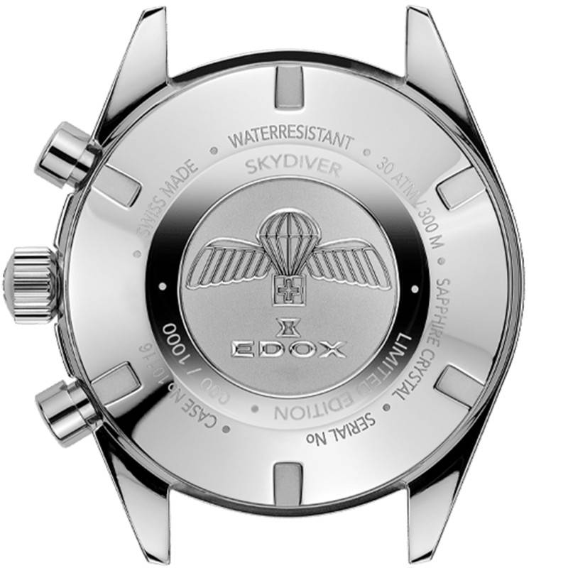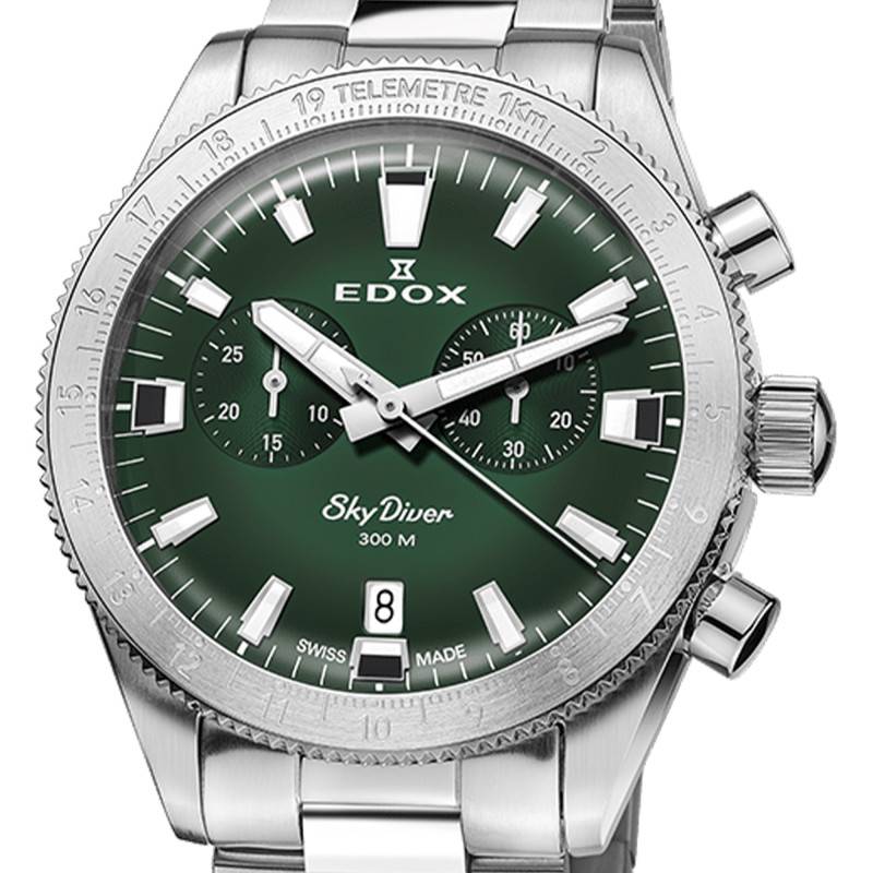 La montre Skydiver Chronograph de la marque Edox est un superbe exemple de style et de technologie horlogère de pointe, fabriquée en Suisse. Le boîtier de forme ronde, fabriqué en acier inoxydable de haute qualité, offre une finition mate parfaitement brossée et satinée qui lui confère une allure à la fois robuste et sophistiquée. Ce boîtier présente un diamètre de 40 mm et une épaisseur de 13,90 mm, offrant une présence affirmée au poignet tout en étant suffisamment confortable pour un port quotidien. Avec un poids de 139 g, elle porte élégamment les éléments de son design bien pensé.