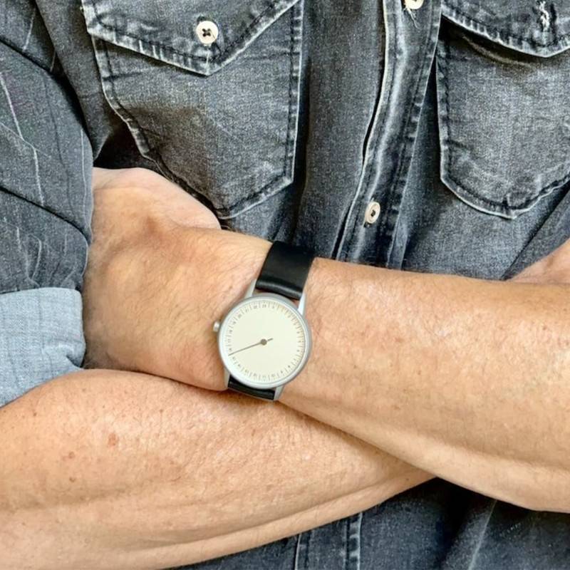 Ce modèle dispose d'un cadran blanc épuré et minimaliste. On y reconnaît le style germanique par la police d'écriture. En son centre, une unique aiguille anthracite indique les heures et les minutes à l'aide du chemin de fer des minutes qui parcourt l'entièreté du cadran. Des index en bâtons accompagnent les 24 chiffres arabes, permettant au cadran d'afficher une lecture 24H.