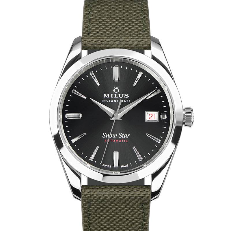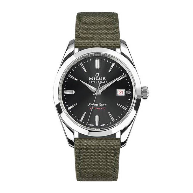 Ocarat vous présente ce superbe garde-temps présenté par la marque Milus. Cette maison horlogère Suisse voit le jour au pied du Jura en 1919. Depuis sa reprise en 2016, la marque se renouvelle et innove en proposant des pièces ingénieuses, créatives sans jamais perdre l'héritage laisser par son créateur. Véritable témoignage historique, elle vous présente aujourd'hui sa réédition du modèle Snow Star. Créee dans les années 40, elle accompagnait alors l'aéronavale américaine. Elle constituait alors l'un des objets précieux contenus dans des mallettes destinées à servir de monnaie d'échange en territoire inconnu, assurant alors la survie des soldats et l'obtention d'informations. Authentique et élégant, son boîtier est constitué d'un boîtier en acier 904L au polissage miroir. Ce superalliage utilisé par les meilleures maisons horlogères résiste parfaitement à la corrosion et aux chocs. C'est pourquoi il est utilisé dans l'industrie chimique et même dans l'industrie spatiale. Le boîtier affiche un diamètre de 39mm de diamètre, idéal pour un poignet masculin. Afin de protéger au mieux le cadran, ce dernier s'équipe d'un verre Saphir bombé avec traitement antireflet intérieur, le meilleur de sa catégorie. A trois heures, vous retrouverez une couronne crantée argentée utile pour effectuer le réglage de vos aiguilles ainsi que du guichet date. Enfin, son fond de boîte vissé offrira une étanchéité de 30 atmosphères. La montre vient avec un charmant étui inspiré du coffret original afin de rester dans l'esprit chic et authentique de la marque.