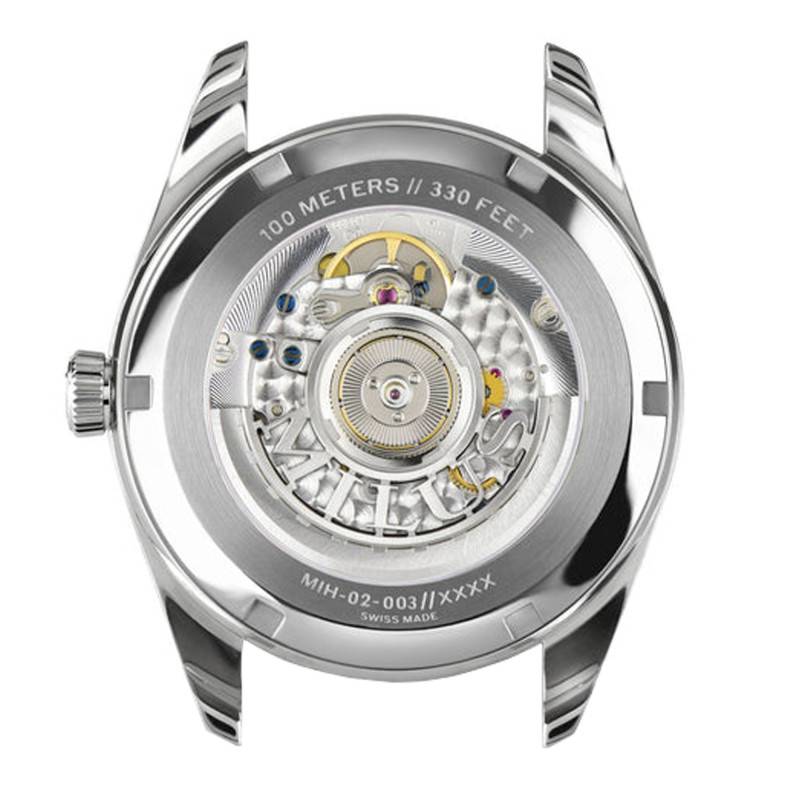 Ce modèle est alimenté par un mouvement automatique suisse ETA 2892 A2, réputé pour sa précision et sa fiabilité. Oscillant à une fréquence de 28.800 (4 Hz) offrant une réserve de marche de 42 heures, ce dernier est équipé de 21 rubis et promet des hautes performances. Accompagnée de vis bleues et de ponts perlés et calimaçonnés, sa masse oscillante est ajourée et personnalisée par le logo Milus.