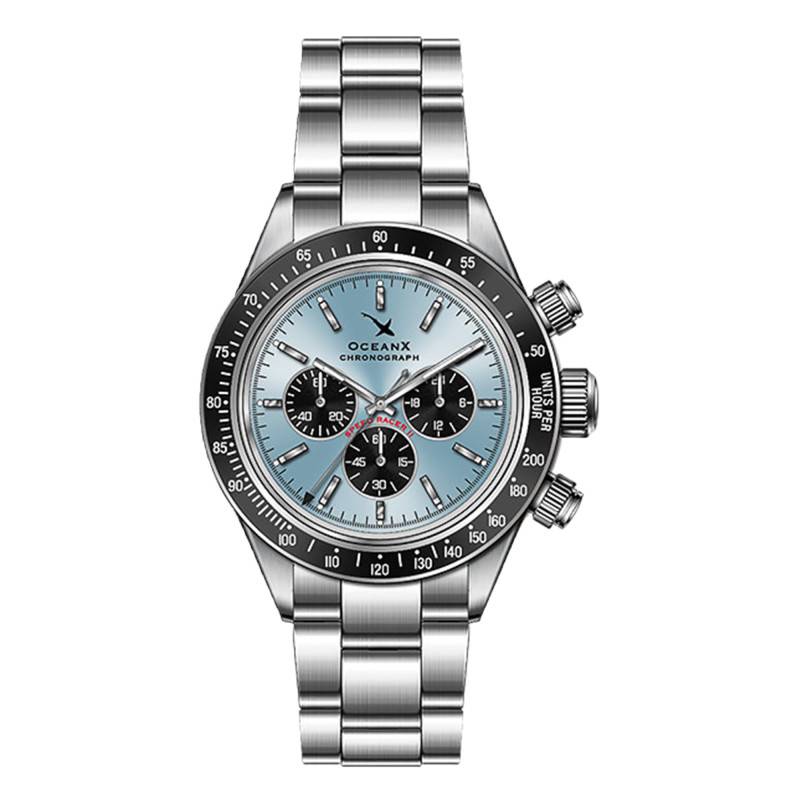 Ocean X est une marque d'horlogerie qui propose des montres robustes et professionnelles conçues pour durer toute une vie. Leurs garde-temps sont modernes avec des designs classiques pour les passionnés des aventures nautiques. Ainsi, elle propose cette Speed Racer II Chronographe. Son boîtier se compose d'une lunette tachymétrique vous permettant de mesurer les vitesses de déplacement. Cette dernière est faite en acier poli avec un insert en céramique noir gradué avec des chiffres arabes. Il entoure un verre saphir bombé de 3,3 mm d'épaisseur avec un traitement antireflet qui permet une meilleure lecture du cadran. Disposant d'une forme ronde, ce boîtier a été confectionné en acier brossé et poli et mesure 41,5 mm de diamètre, 14 mm d'épaisseur avec une largeur d'entrecorne de 50 mm. Ce garde-temps peut être utilisé en milieux aquatiques grâce à son fond vissé en acier qui assure une étanchéité de 20 ATM. La fonction chronographe est contrôlée par deux boutons-poussoirs qui sont situés de part et d'autre de la couronne crantée. Cette dernière, en acier brossé et poli, sert à régler les heures et les minutes.