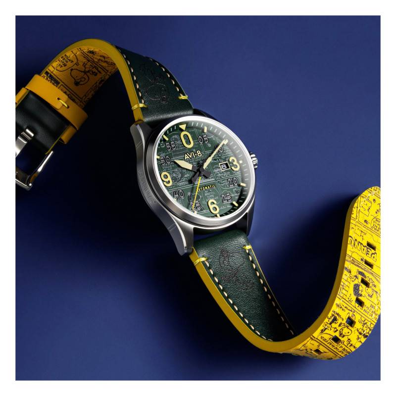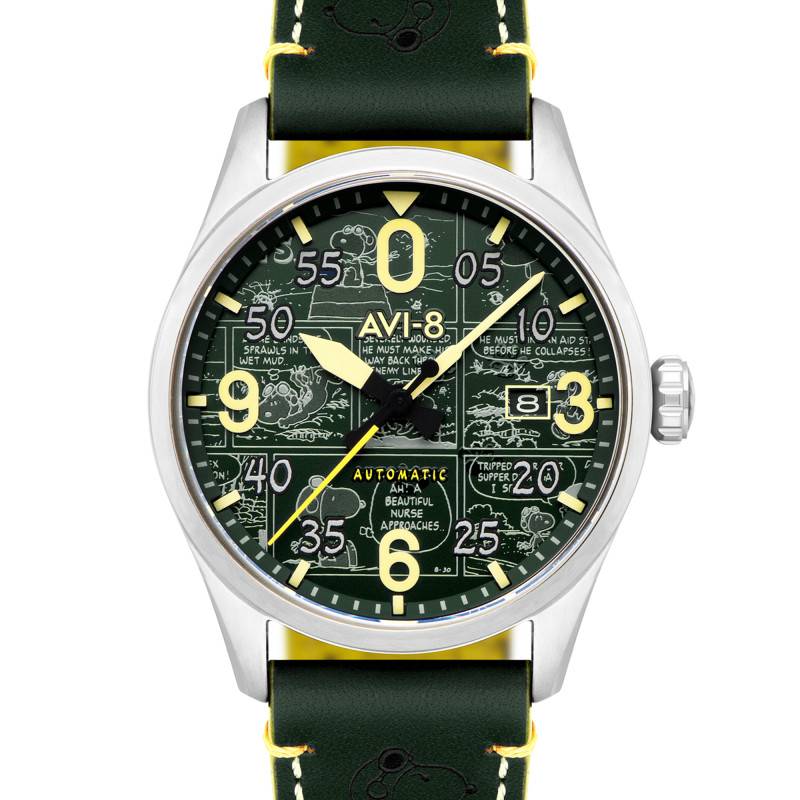 Le cadran de cette montre présente une riche teinte verte, ornée de détails peints qui mettent en exergue un monde de subtilité et de sophistication. L'inscription Peanuts Snoopy Flying Ace et des dessins techniques d'avion constituent le thème central, apportant un brin d'originalité et d'hommage à l'histoire de l'aviation. Les chiffres arabes sont proposés en grand format, offrant une facilité de lecture immédiate. A 3 heures, le guichet date est harmonieusement incorporé, concédant une symétrie irrésistible à l'ensemble du cadran.