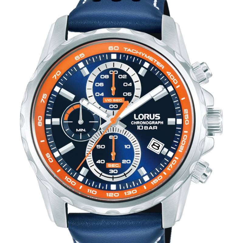 Le cadran de cette montre se pare d'un magnifique bleu soleillé, conférant une profondeur et un éclat remarquables sous toute source lumineuse. La lecture de l'heure est facilitée par des aiguilles et des index luminescents, gages d'une lisibilité parfaite même en conditions de faible luminosité. En plus des traditionnelles heures, minutes et secondes, le cadran intègre un guichet pratique pour l'affichage de la date, positionné stratégiquement à 4 heures pour un accès visuel rapide, sans nuire à l'esthétique générale. Trois compteurs additionnels hébergent les fonctions chronographe permettant un décompte précis des temps grâce aux 60 minutes, 60 secondes et mesure au 1/10e de seconde. La lunette tachymétrique, accentuée avec une finition orange, termine superbement le look sportif de ce garde-temps.