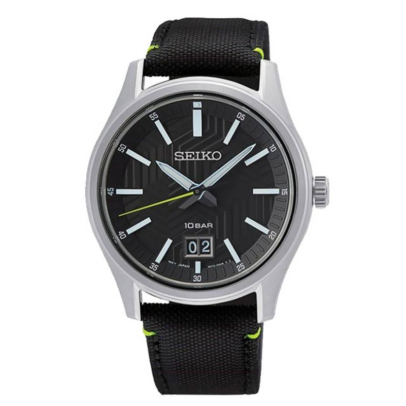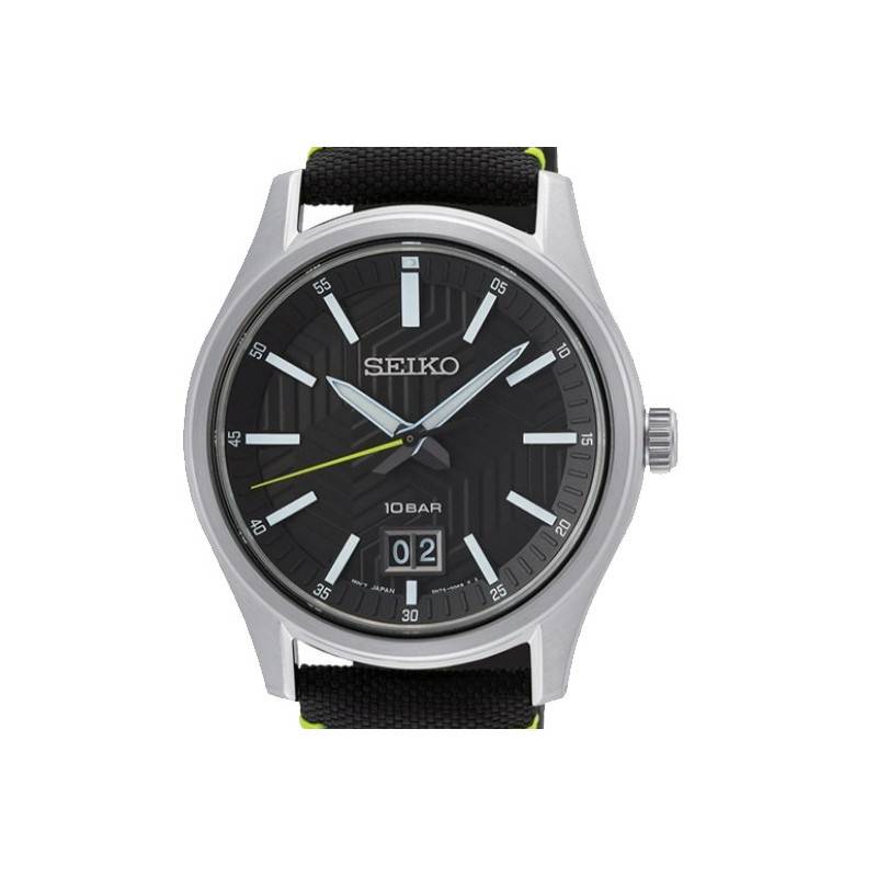 C'est un cadran rond très chic qui a été choisi pour habiller cette montre. Au centre, deux aiguilles argentées s'articulent pour vous indiquer les heures, le minutes. Les secondes sont elles indiquées par une trotteuse vert citron. Un chemin de fer des minutes est situé sur le pourtour. Tout autour, vous trouverez de cinq en cinq les minutes indiquées. De plus, un guichet date sur fond noir se place au-dessus de l'index de 6 heures pour informer de la date du jour. Enfin, Seiko pose son nom sous l'indice des douze heures.