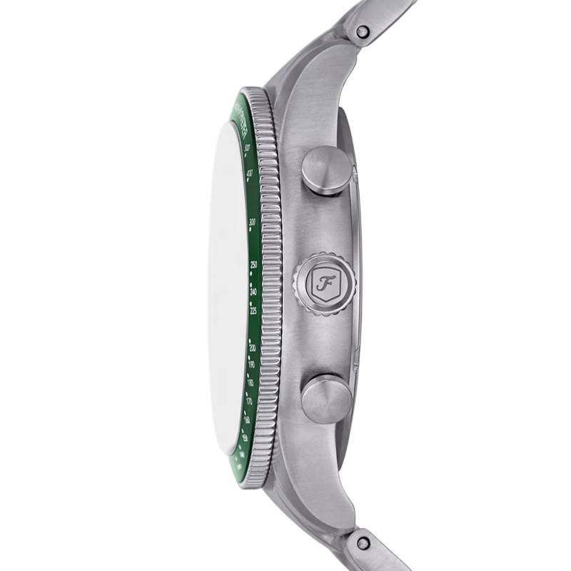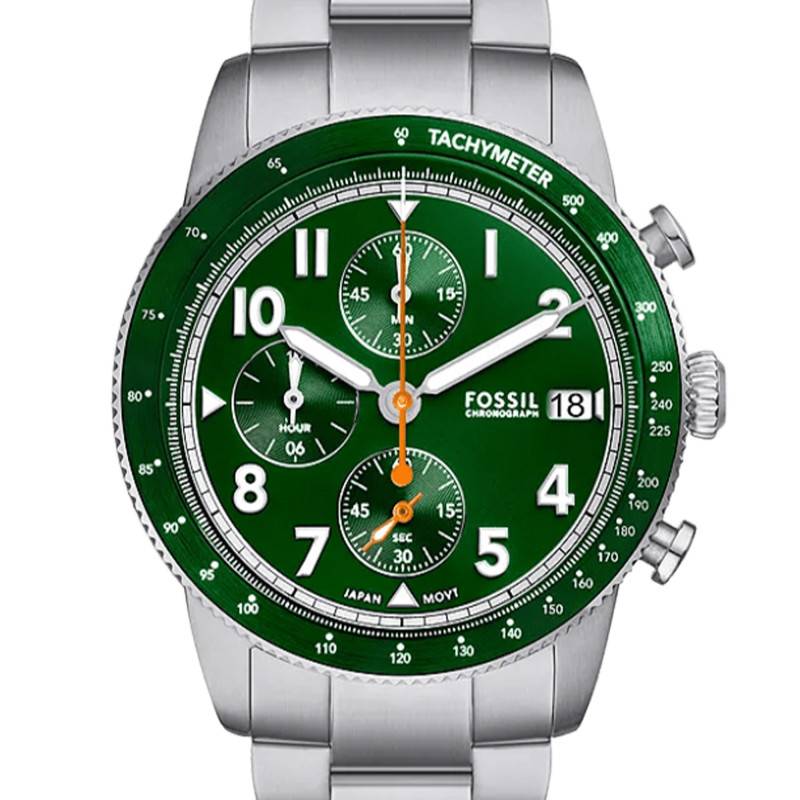 Fossil élabore des montres fabuleuses avec un style à l'américaine. Avec son savoir-faire et ses années d'expérience, elle vous propose des modèles alliant élégance, fiabilité et technicité pour un usage au quotidien. Ses garde-temps sont à la fois classiques et sportifs ce qui vous permettra de les porter en toute occasion et avec toutes les tenues de votre choix. Aujourd'hui, la marque vous présente la montre Sport Tourer FS6048 destinée à la gent masculine. Elle dévoile un boîtier de 42 mm de diamètre avec une épaisseur de 13 mm. De forme ronde, ce dernier est entièrement réalisé en acier inoxydable brossé et dispose d'une allure raffinée. De plus, il se pare d'une lunette rotative avec un insert vert doté d'une échelle tachymétrique et qui entoure un verre minéral. Transparent, celui-ci surmonte les éléments centraux qui sont manipulés par les boutons-poussoir et la couronne. Cette dernière est de couleur argentée et se pare d'un aspect cranté ce qui vous accordera une prise en main facile. Enfin, ce garde-temps se ferme par un fond de boîte vissé assurant une étanchéité de 5 ATM.