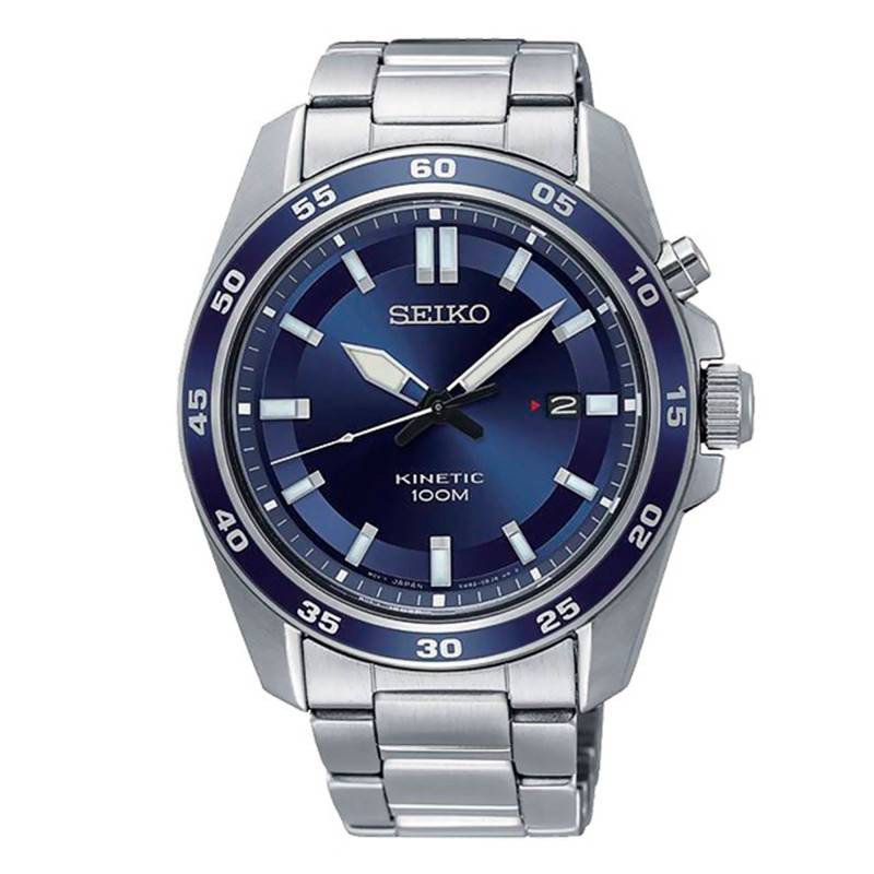 La maison horlogère Seiko nous offre ce garde-temps de la collection Sport qui est doté de la technologie Kinetic. Cette montre se caractérise par un boîtier en acier inoxydable qui mesure 42,6 mm de diamètre et 11 mm d'épaisseur. Elle est également dotée d'un verre Hardlex (verre minéral trempé) qui permet d'être plus robuste qu'un verre minéral simple. Une touche élégante est apportée grâce à son cadran bleu foncé soleillé qui est entouré par la lunette incluant un chemin de fer des minutes. Le fond de boîte est vissé et fait apparaître le mouvement de la montre. Enfin, la couronne, située à trois heures, permet de régler l'heure de la montre; et le bouton poussoir situé à deux heures aide à vérifier la réserve de la marche. Cette montre, avec un aspect masculin, séduira les sportifs.