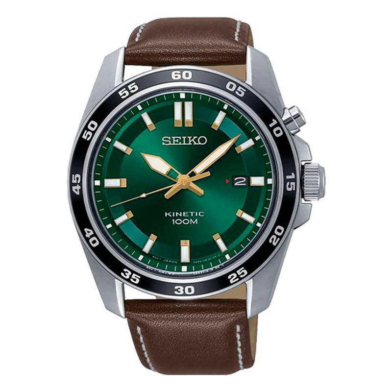Cette montre vous propose un fond vert, finition soleillée, apportant un look à la fois chic et décontracté. Les index des heures sont marqués par des index en bâtons blancs luminescents avec un contour doré bien contrasté. Les aiguilles des heures et des minutes sont également entourées de doré et remplies d'une matière blanche luminescente vous permettant de regarder le temps même dans l'obscurité. La matière ici appliqué est une matière Lumibrite, brevetée par Seiko, connue pour sa grande phosphorescence. La trotteuse est quant à elle pleinement dorée et fine avec une délicate goutte blanche qui brille dans l'absence de lumière. Le très discret chemin de fer placé en relief du cadran arbore un marquage blanc pour les minutes/secondes et un bâton court et épais pour chaque heure. Pour vous aider à repérer la date, le guichet date se situe à 3 heures alors que le logo Seiko est traditionnellement placé à 12 heures. Juste au-dessus de l'index des 6 heures, une inscription blanche rappelle que la montre est équipée d'u mouvement Kinetic, et que son étanchéité est de 100 mètres.