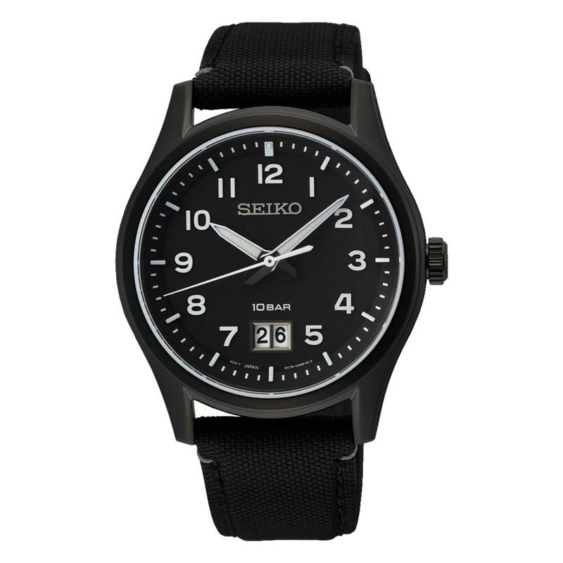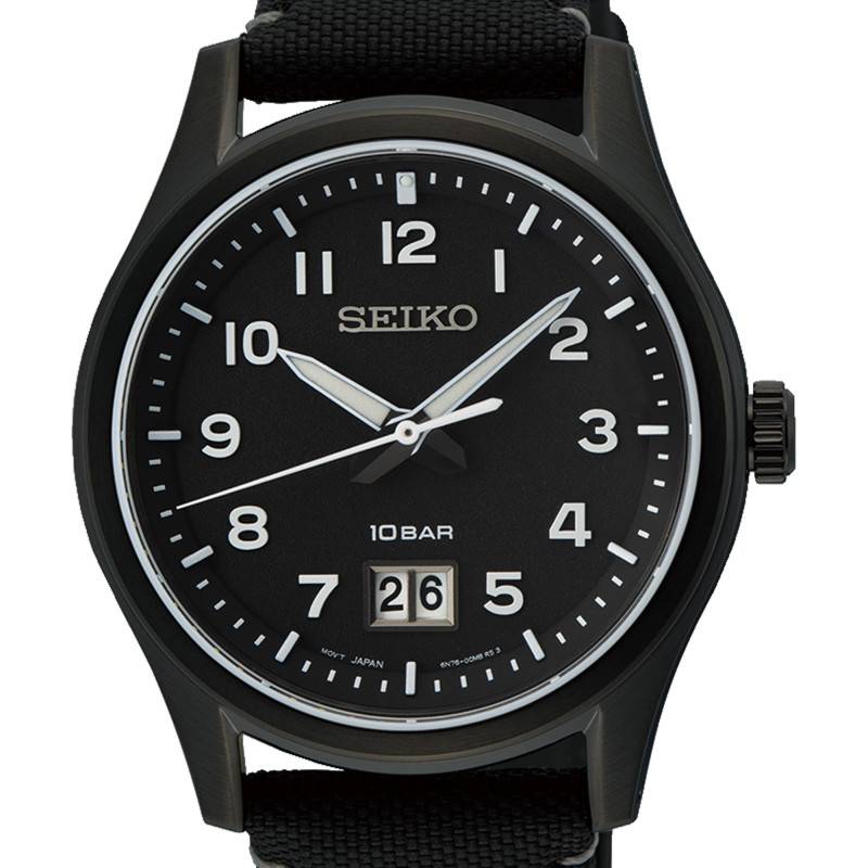 Ce cadran rond se démarque par sa couleur noire, teinte dominante de la montre. Il offre une lecture temporelle fluide des différents indicateurs. Sur le pourtour de ce cadran, est gradué un chemin de fer des minutes et des chiffres arabes blancs. Ces derniers, de même que les deux aiguilles qui les parcourent, sont revêtus d'un traitement lumibrite qui facilite la lecture temporelle même dans les endroits faiblement éclairés. Elles s'activent pour indiquer les heures et les minutes, tandis que la trotteuse blanche communique les secondes. Vous trouverez à 6 heures un guichet grande date ainsi que la mention de l'étanchéité. Pour finir, Seiko signe avec son nom sa création à midi.