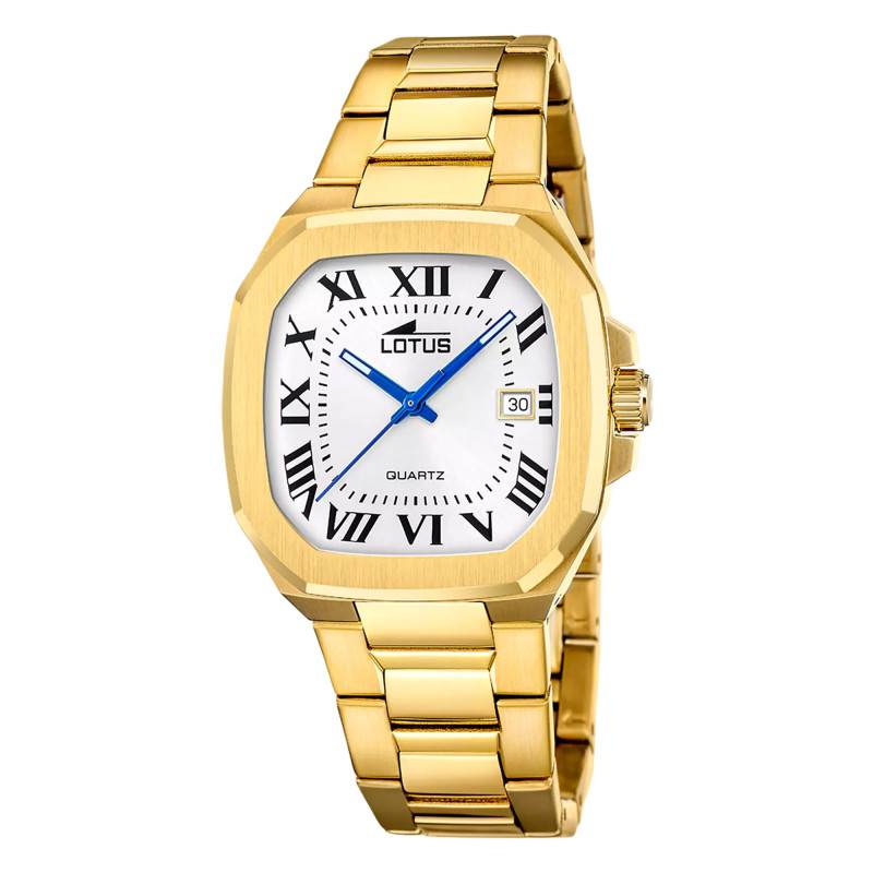 La montre pour homme de la série Square Series par Lotus se distingue par sa forme carrée élégante et son design sophistiqué. Conçue en acier inoxydable doré, elle affiche une allure raffinée et luxueuse. Le boîtier robuste, pesant 127 g, garantit une protection optimale tout en arborant une finition mate qui accentue son caractère distinctif. Avec un diamètre de 40 mm et une épaisseur de 10,15 mm, elle a été pensée pour offrir un confort optimal tout en rehaussant le poignet de son porteur par une touche de classe indéniable. Le verre minéral plat qui la protège est résistant et assure une transparence parfaite pour admirer le cadran.