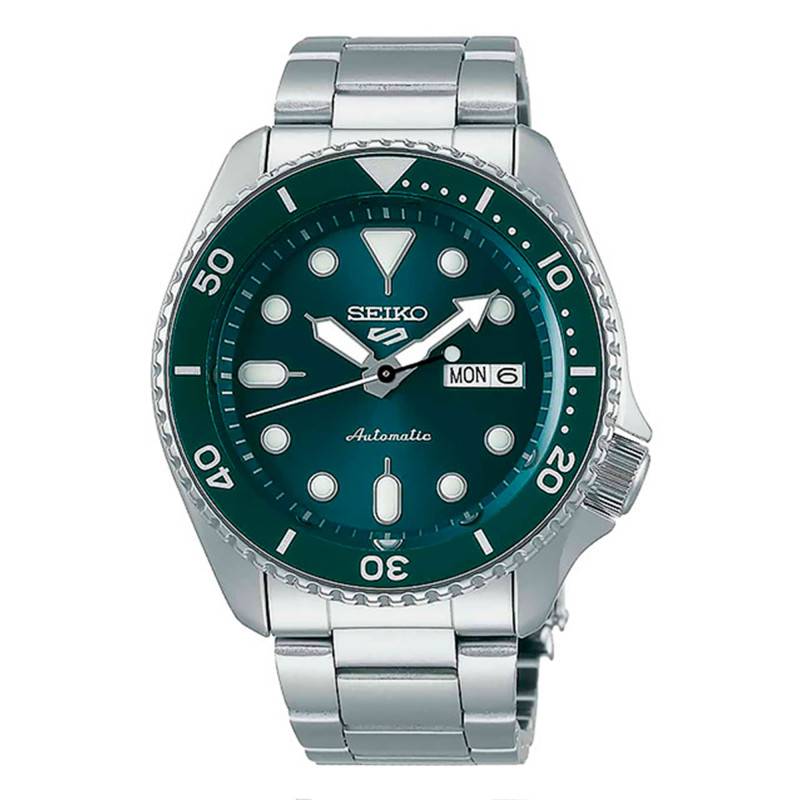 Comme vous pouvez le constater ce modèle a une apparence très singulière dans un style à la fois élégant et sportif. Son cadran de forme ronde est doté d'un fond de couleur verte. Dessus, vous remarquerez des index blancs de différentes formes géométriques. Ils sont revêtus du traitement LumiBrite. Avec ce système, vous serez toujours capables de lire l'heure malgré une luminosité difficile. Deux aiguilles ainsi qu'une trotteuse vont accompagner ces éléments sur le cadran. Elles disposent aussi de ce revêtement LumiBrite pour vous aider dans la lecture de l'heure. A l'index de trois heures enfin, un guichet jour-date trouve place. Afin de signer ce modèle, Seiko va graver le nom de la gamme sous l'index de midi et à six heures, la mention Automatic par rapport au mouvement mis en place.