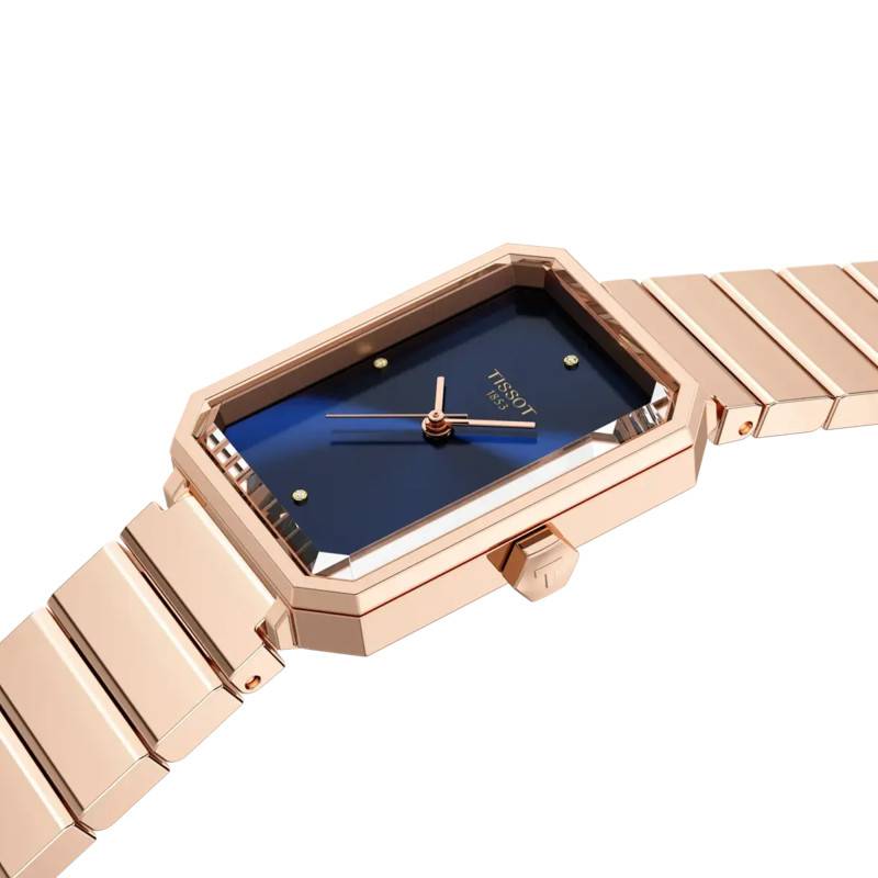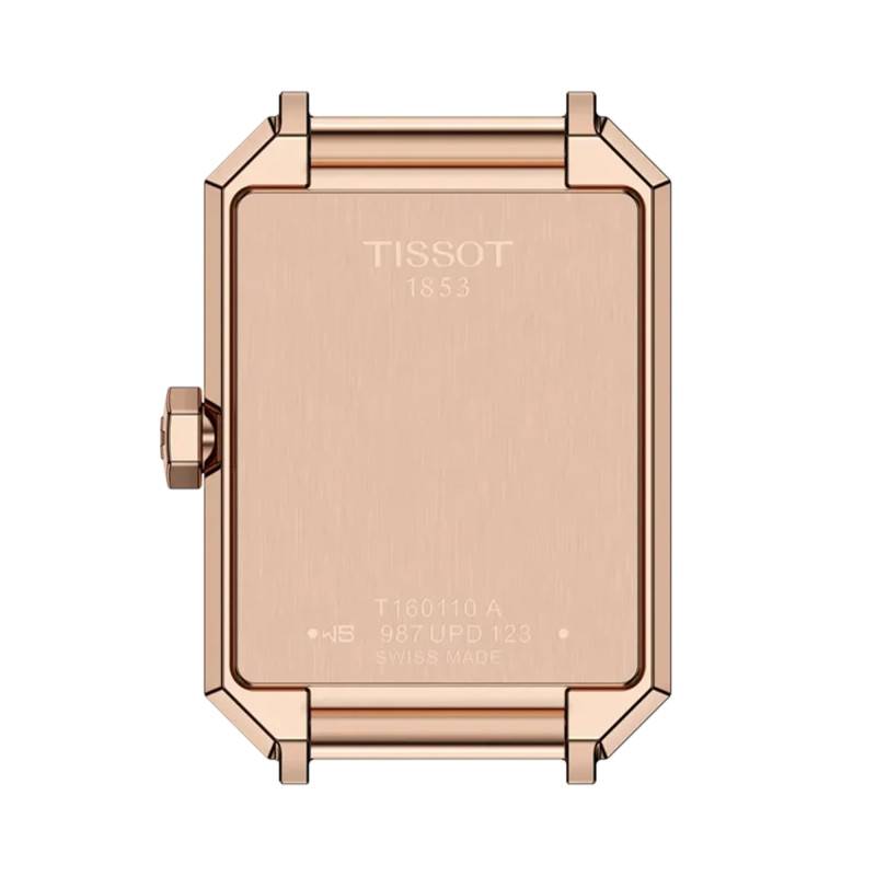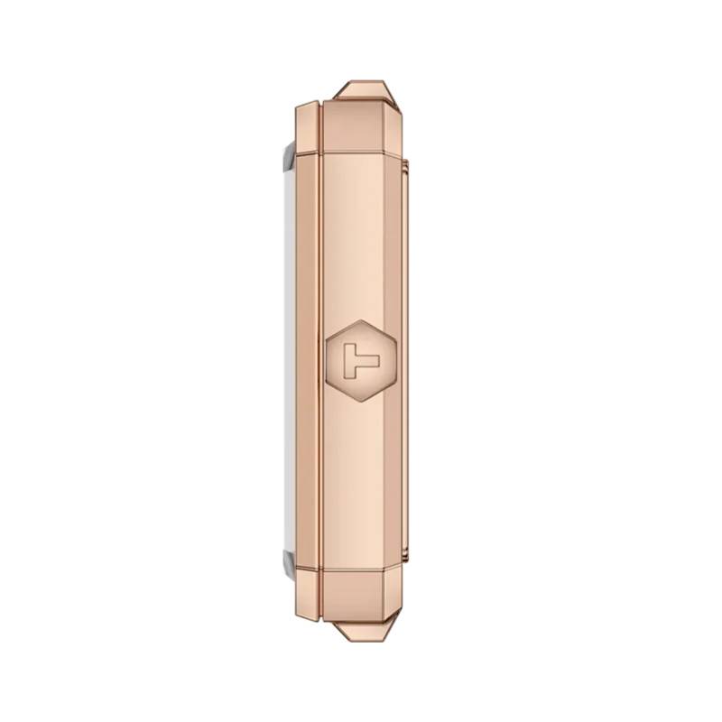 Cette montre Tissot pour femme est l'essence même de la sophistication moderne, intégrant harmonieusement design et matériaux de haute qualité. Le boîtier de forme rectangulaire est fabriqué en acier inoxydable 316L, réputé pour sa solidité et sa résistance à la corrosion, et est fini avec un revêtement PVD or rose qui lui confère une allure à la fois chic et contemporaine. Son poids de 74 grammes témoigne de sa robustesse tout en assurant un confort remarquable au poignet. Le profil mince avec une épaisseur de seulement 7,25 mm assure une adaptation parfaite à tout style vestimentaire, qu'il soit formel ou décontracté. Le fond de boîte est emboité, sécurisant l'intérieur tout en ajoutant une dimension de subtilité discrète à l'ensemble.